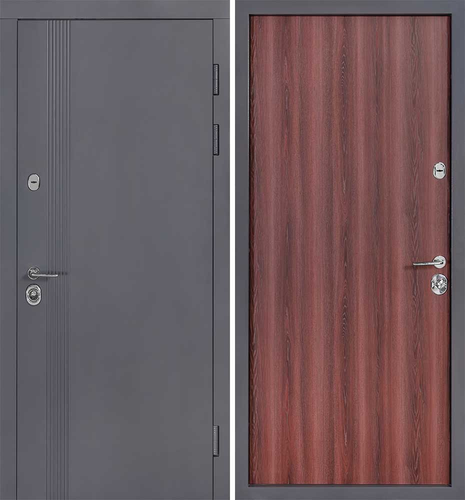 Престиж (квадро) 950 праві — каркас пофарбований у колір Metalic Grey – антрацит. Зовнішня панель моделі – 172, внутрішня панель моделі – Гладка. Без вічка. ПВХ покриття виконане в кольорах: Антрацит №22, Ясень Бургунд Патина 2553 №41 . Оснащені овальною хромованою фурнітурою, замком Securemme, серійний номер дверей S446.