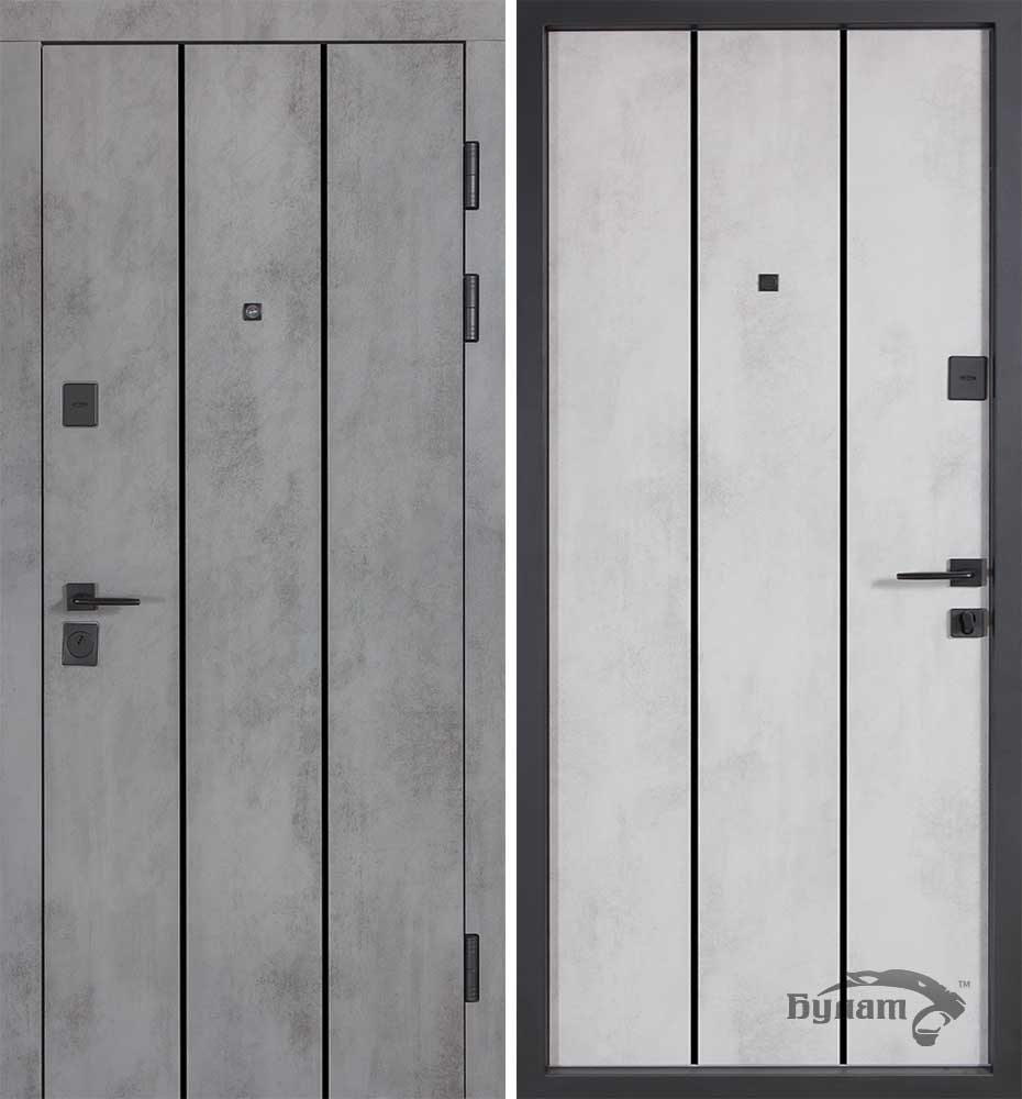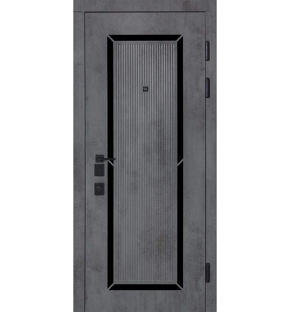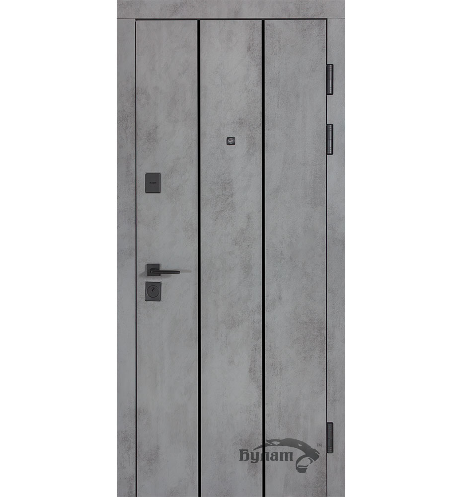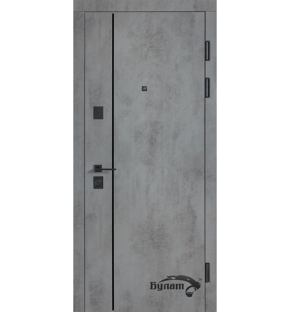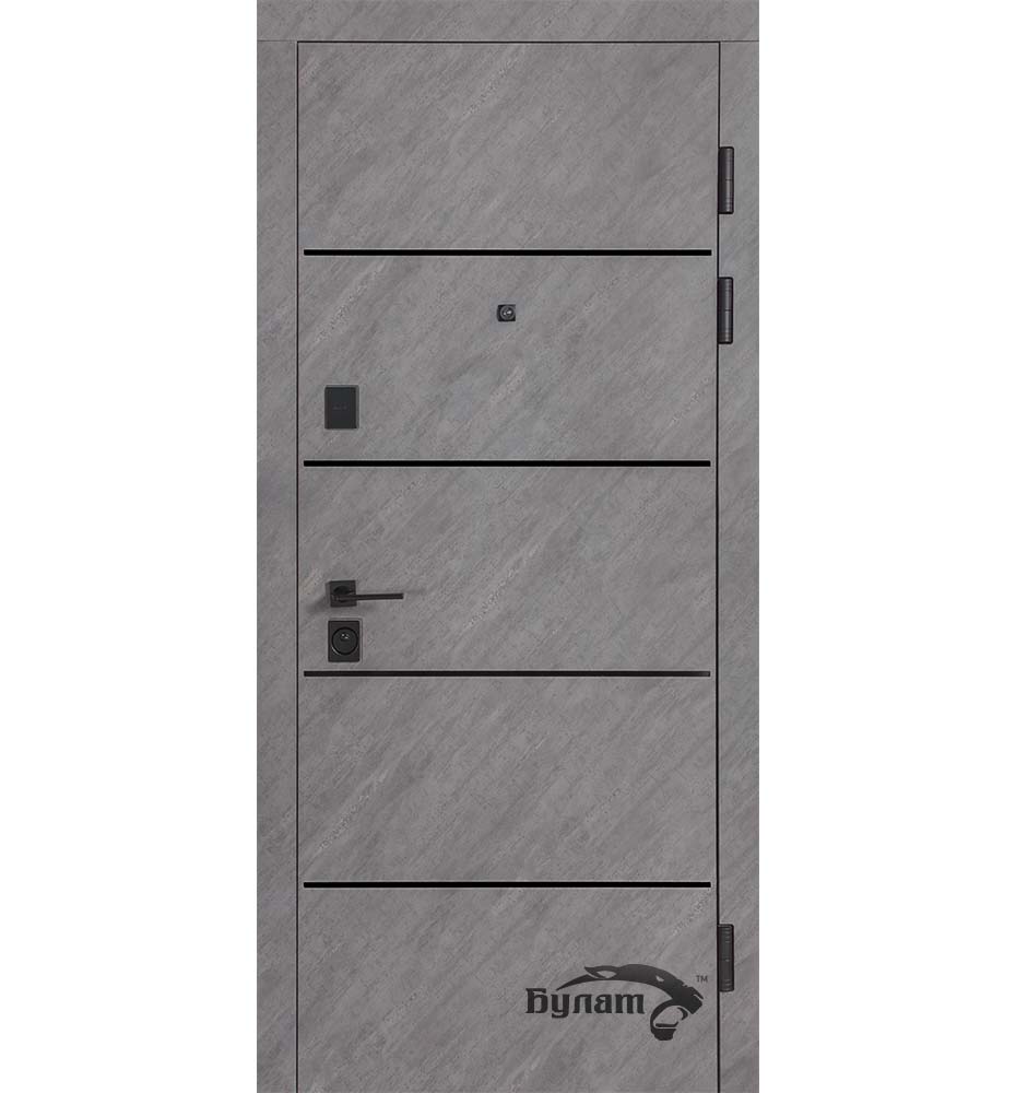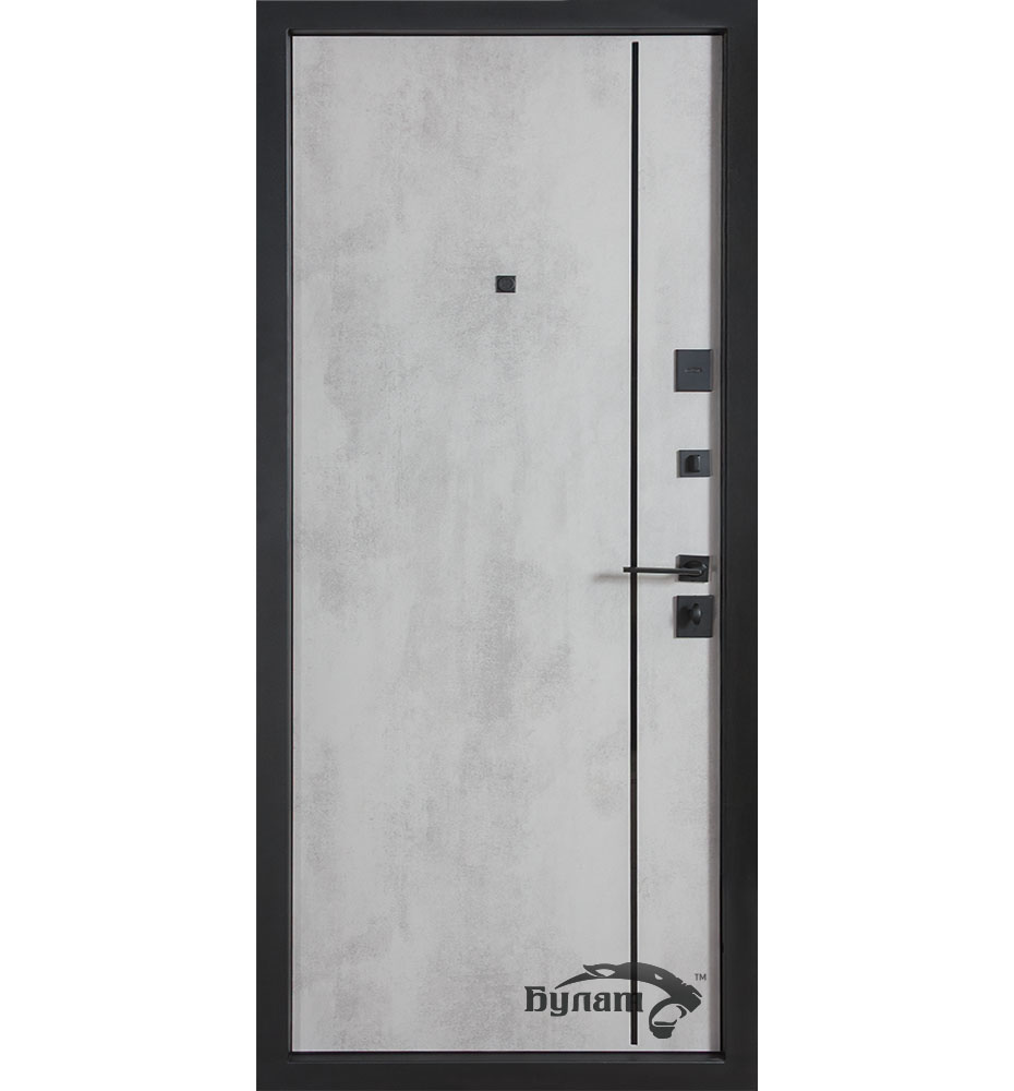 Булат POWER (квадро) 950 ліві — каркас пофарбований у колір Metalic Black – чорна. Зовнішня панель моделі – 194, внутрішня панель моделі – 607 дзеркало без вічка. ПВХ покриття виконане в кольорах: Венге Горизонт Темний (горизонт) №12 / Бетон Сірий 130 №25. Оснащені квадратною хром матовий фурнітурою, замком Mottura 3D Key, серійний номер дверей Т2159.