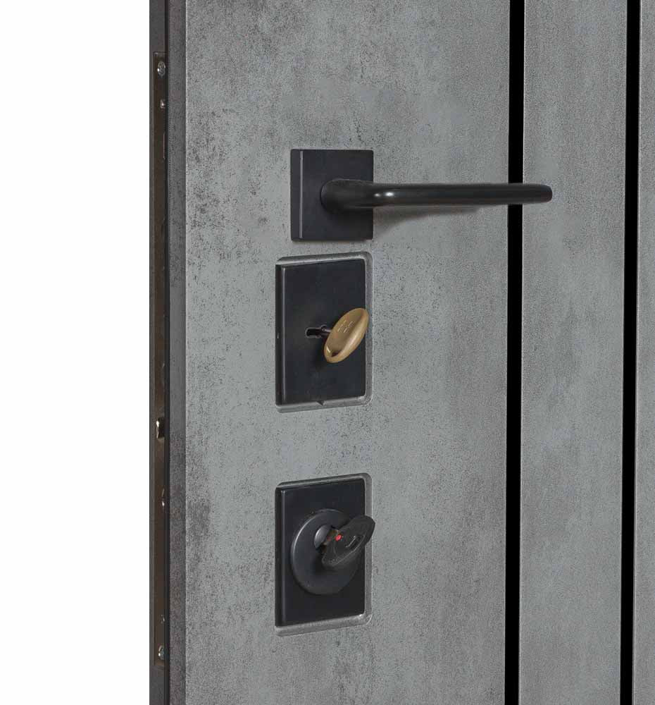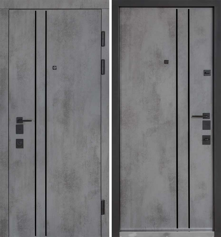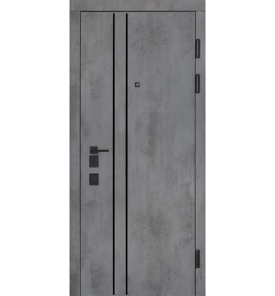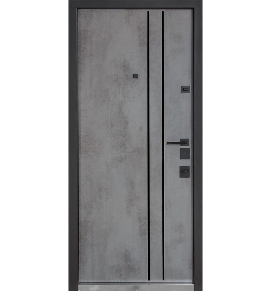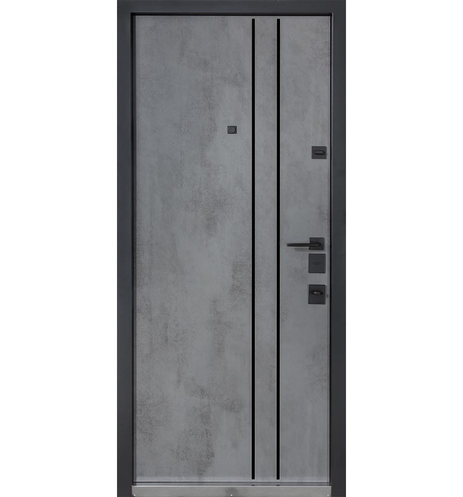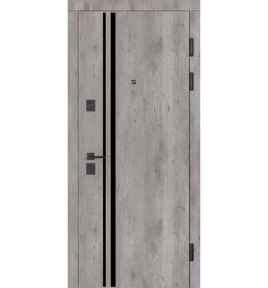 Булат POWER (квадро) 950 ліві — каркас пофарбований у колір Metalic Black – чорна. Зовнішня панель моделі – 194, внутрішня панель моделі – 607 дзеркало без вічка. ПВХ покриття виконане в кольорах: Венге Горизонт Темний (горизонт) №12 / Бетон Сірий 130 №25. Оснащені квадратною хром матовий фурнітурою, замком Mottura 3D Key, серійний номер дверей Т2159.