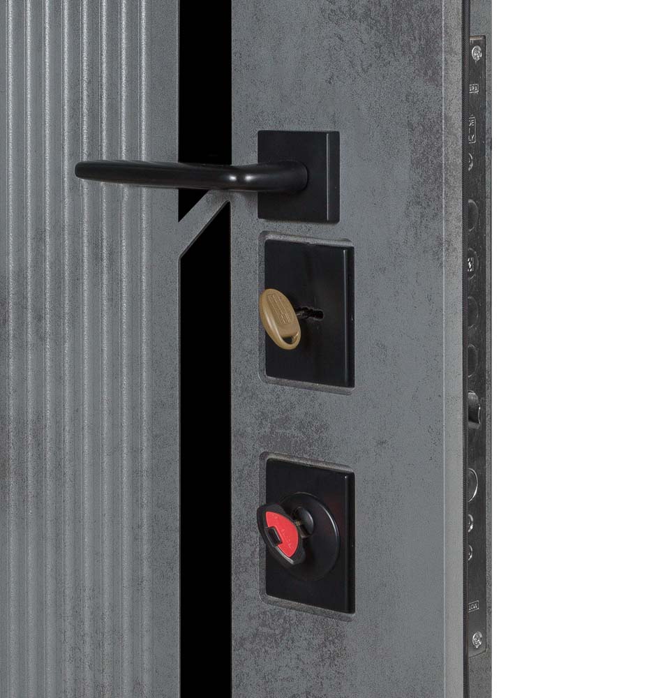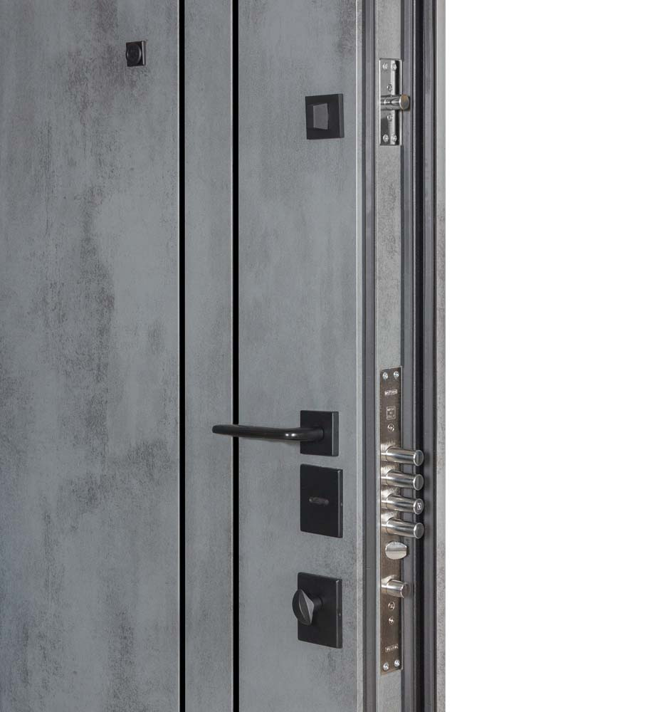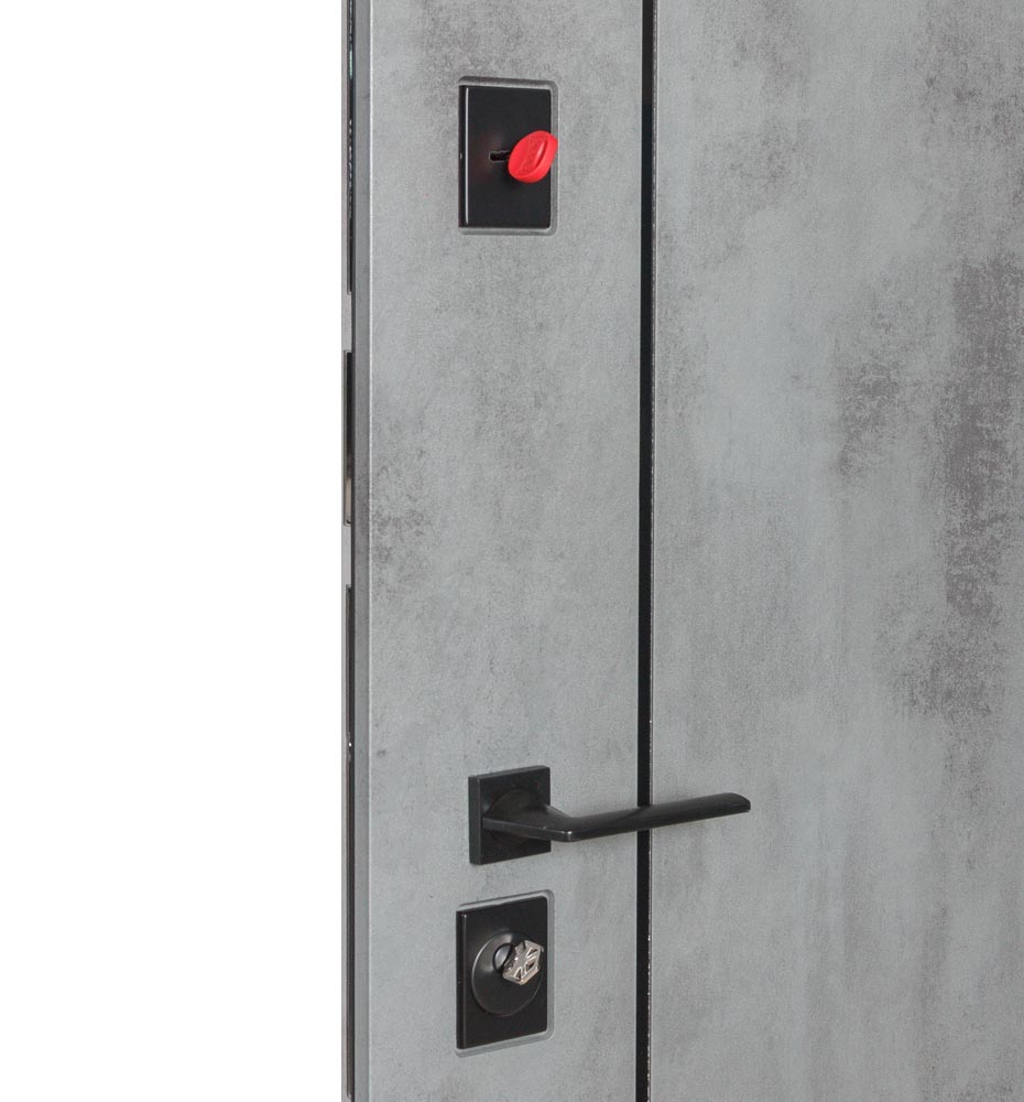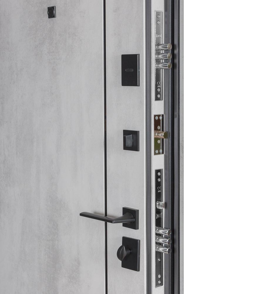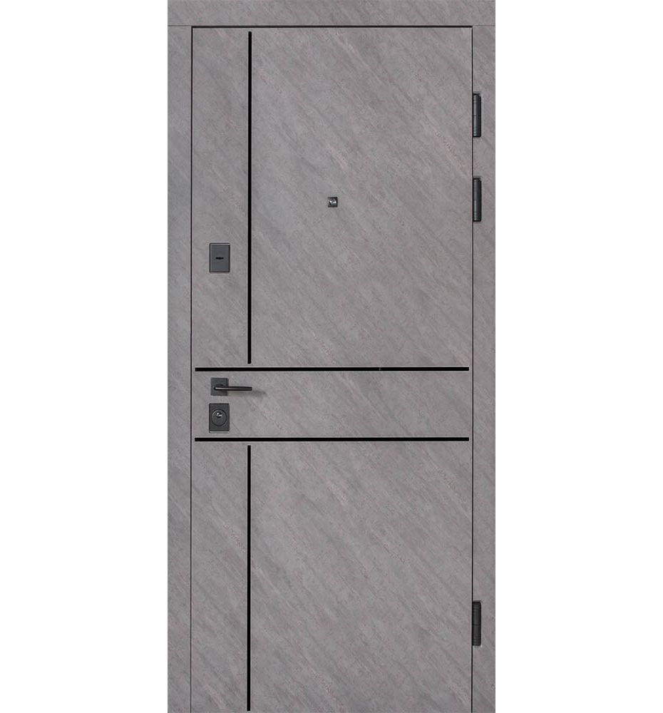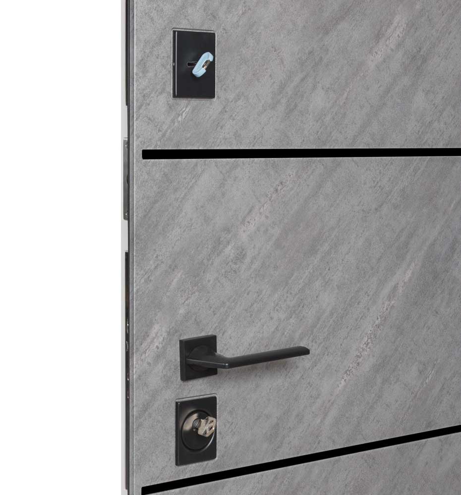 Булат POWER (квадро) 950 ліві — каркас пофарбований у колір Metalic Black – чорна. Зовнішня панель моделі – 194, внутрішня панель моделі – 607 дзеркало без вічка. ПВХ покриття виконане в кольорах: Венге Горизонт Темний (горизонт) №12 / Бетон Сірий 130 №25. Оснащені квадратною хром матовий фурнітурою, замком Mottura 3D Key, серійний номер дверей Т2159.