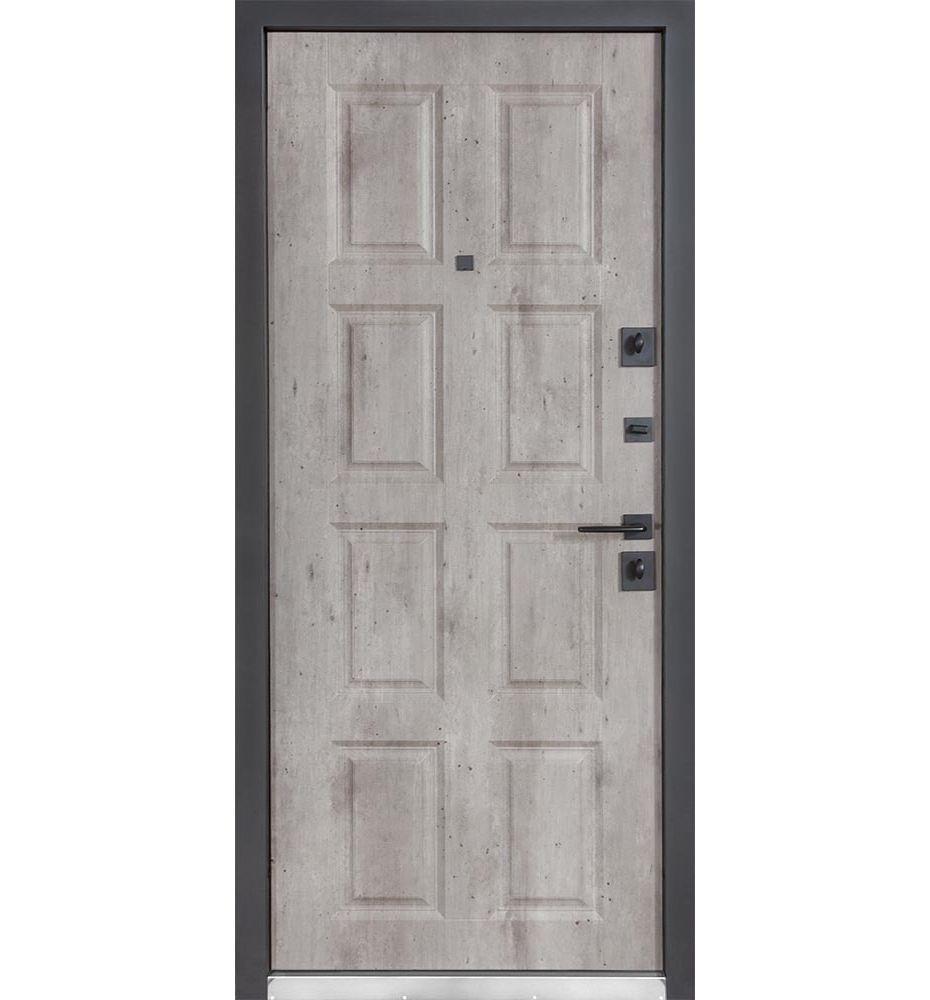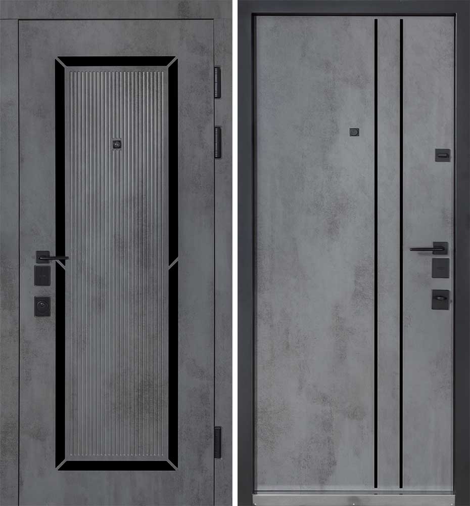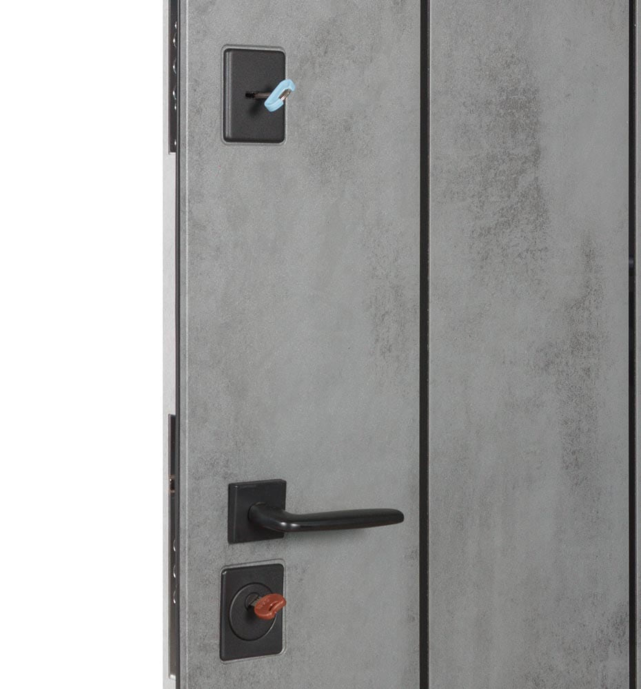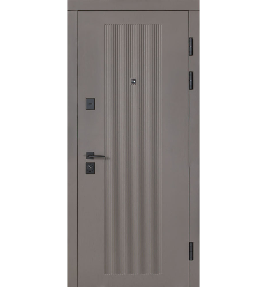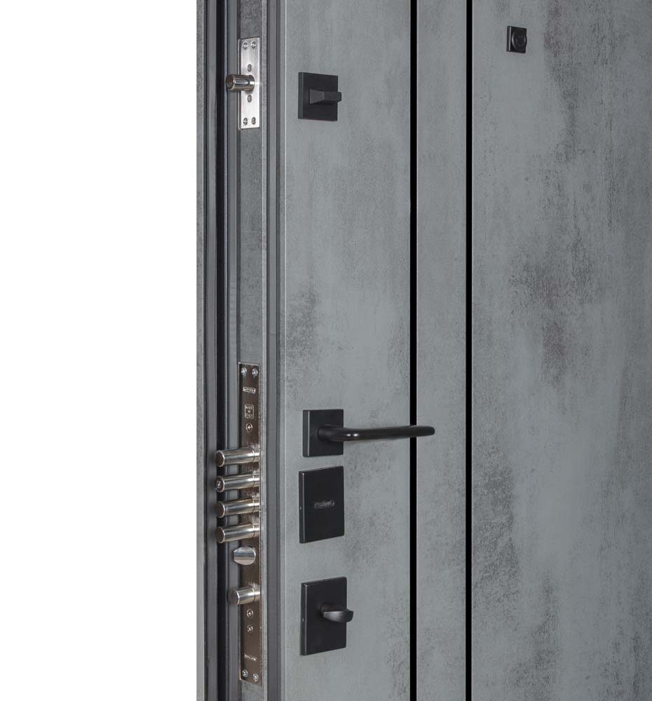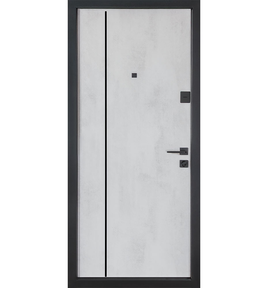 Булат POWER (квадро) 950 ліві — каркас пофарбований у колір Metalic Black – чорна. Зовнішня панель моделі – 194, внутрішня панель моделі – 607 дзеркало без вічка. ПВХ покриття виконане в кольорах: Венге Горизонт Темний (горизонт) №12 / Бетон Сірий 130 №25. Оснащені квадратною хром матовий фурнітурою, замком Mottura 3D Key, серійний номер дверей Т2159.