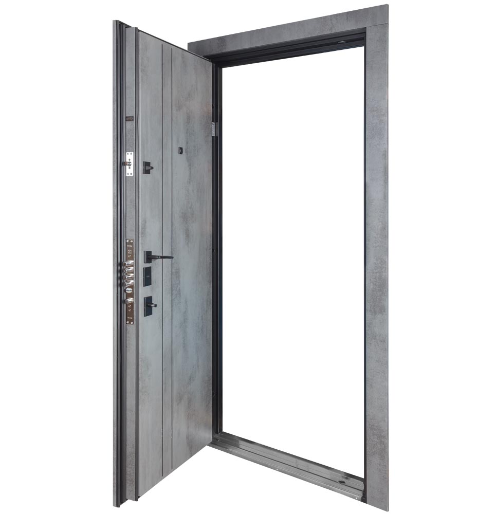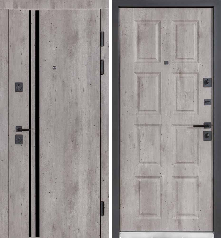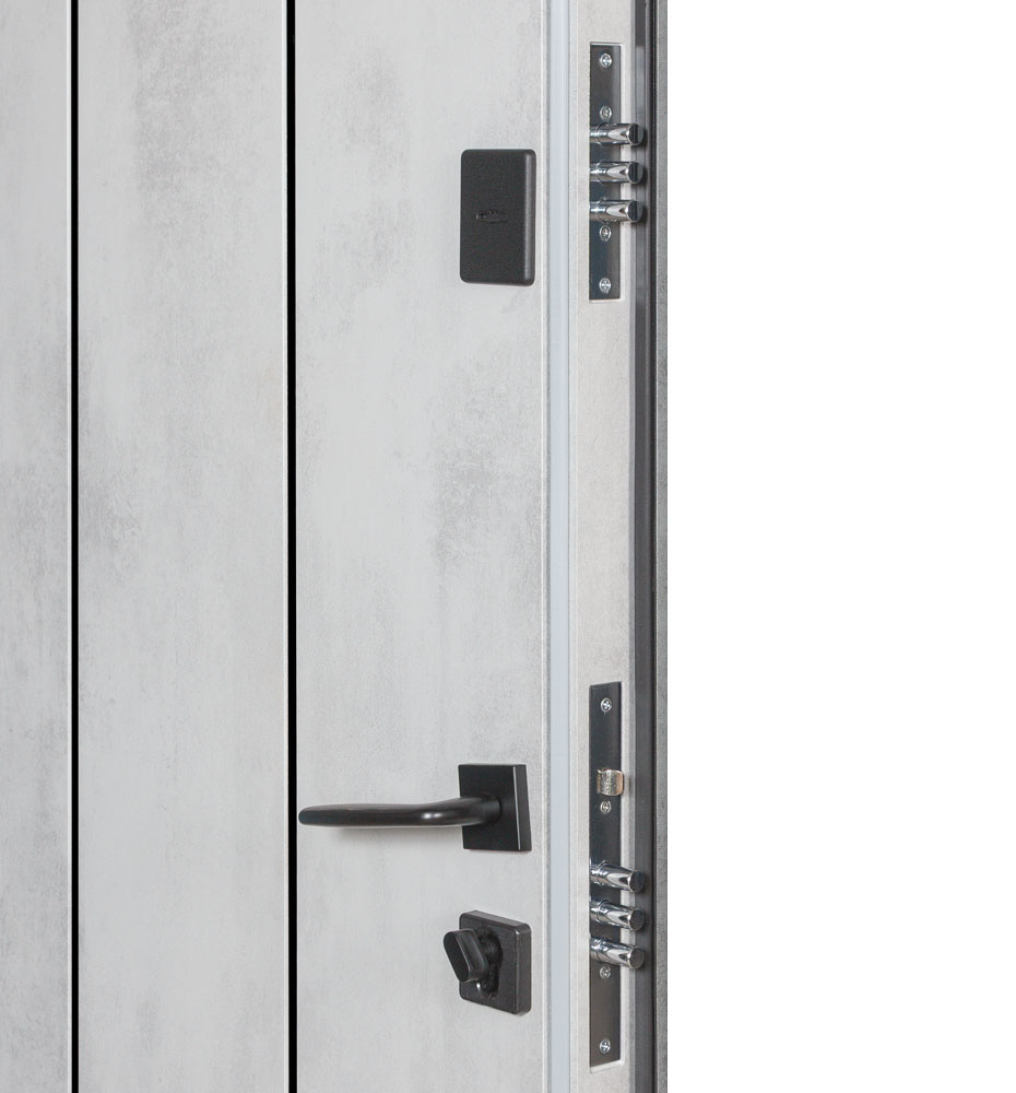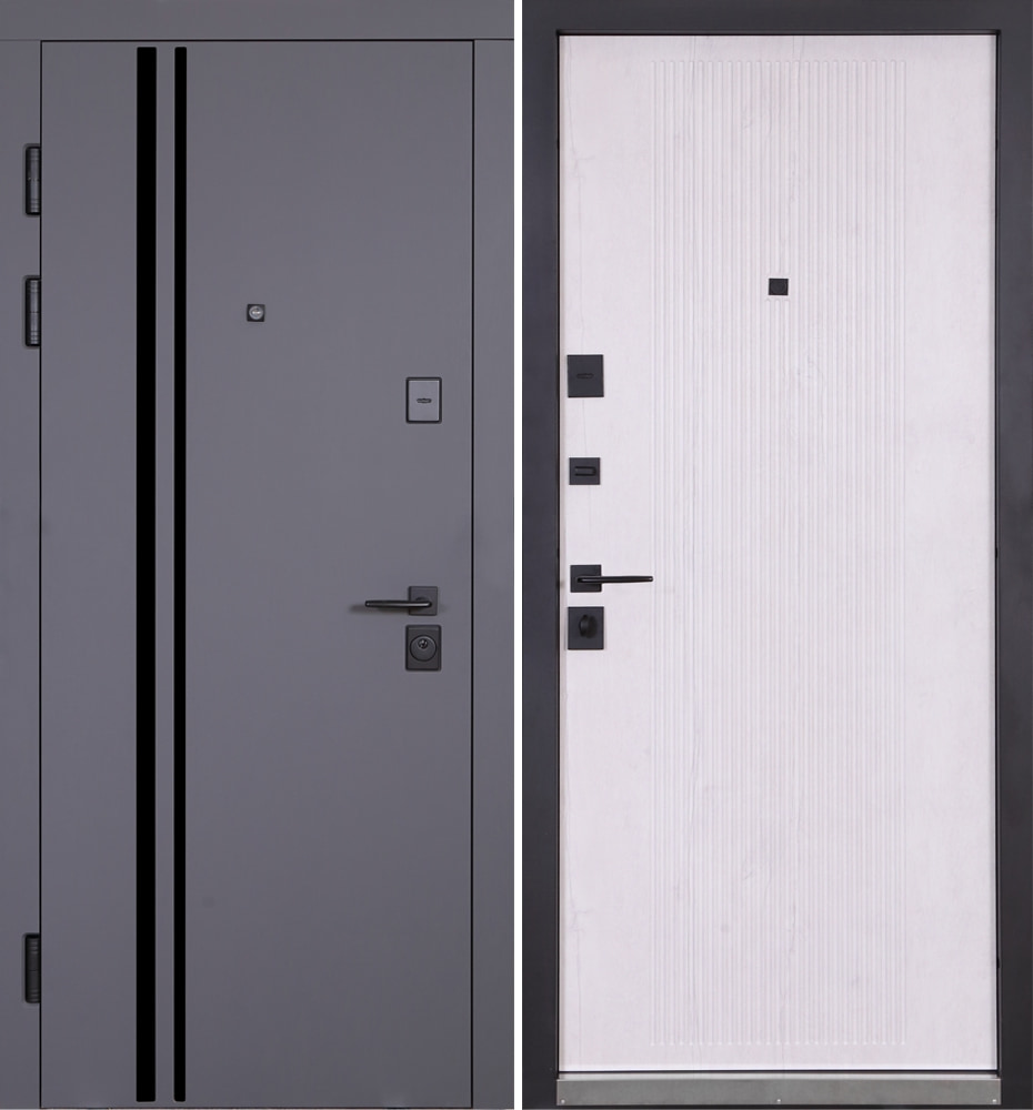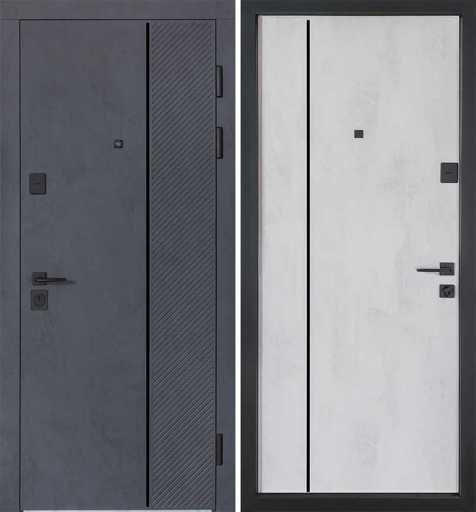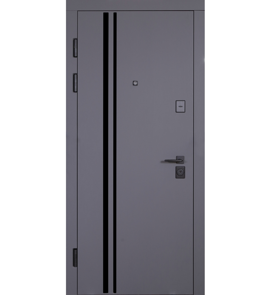 Булат POWER (квадро) 950 ліві — каркас пофарбований у колір Metalic Black – чорна. Зовнішня панель моделі – 194, внутрішня панель моделі – 607 дзеркало без вічка. ПВХ покриття виконане в кольорах: Венге Горизонт Темний (горизонт) №12 / Бетон Сірий 130 №25. Оснащені квадратною хром матовий фурнітурою, замком Mottura 3D Key, серійний номер дверей Т2159.