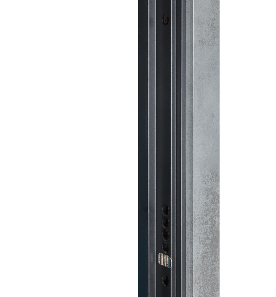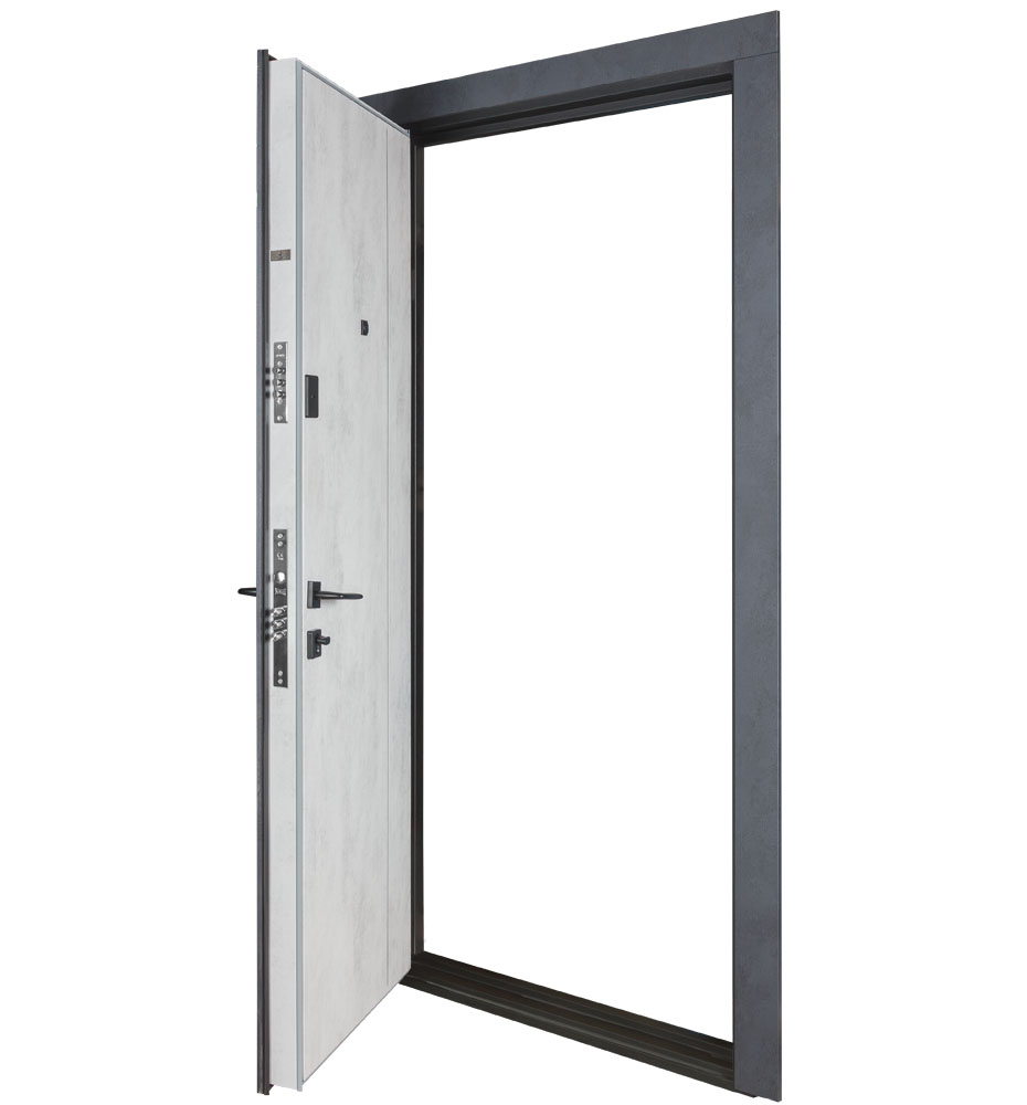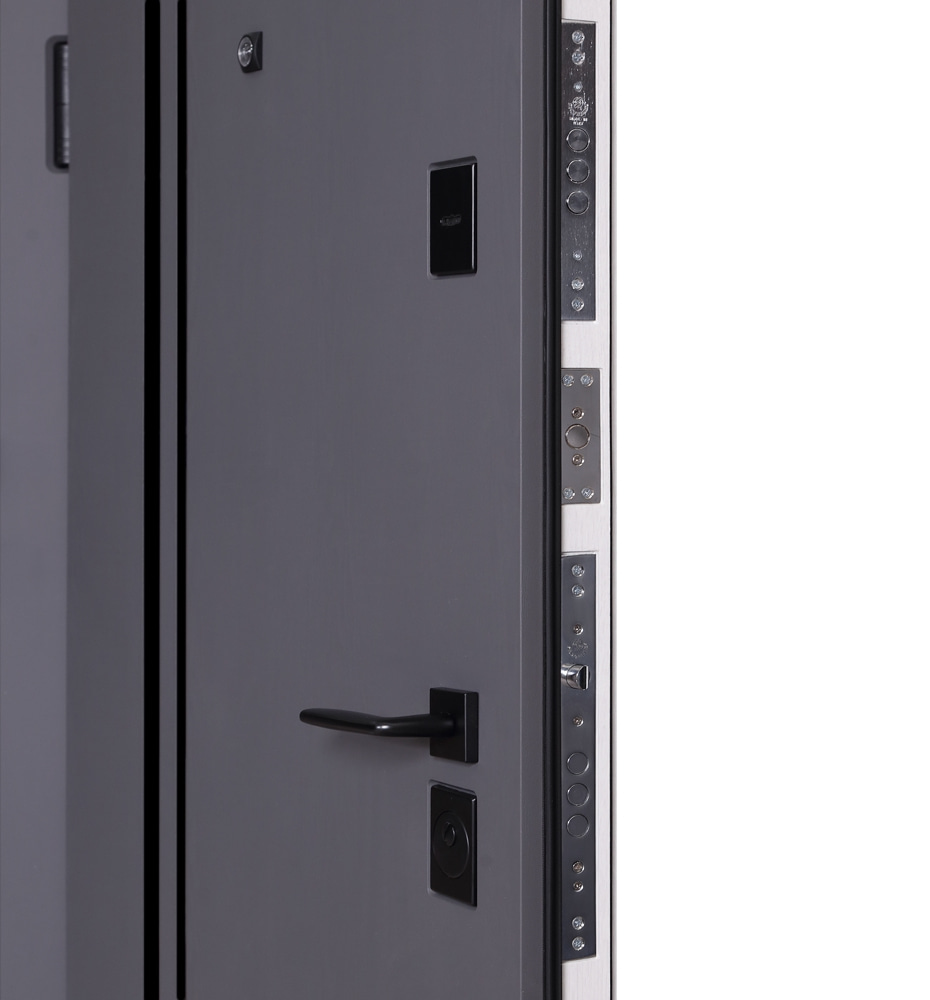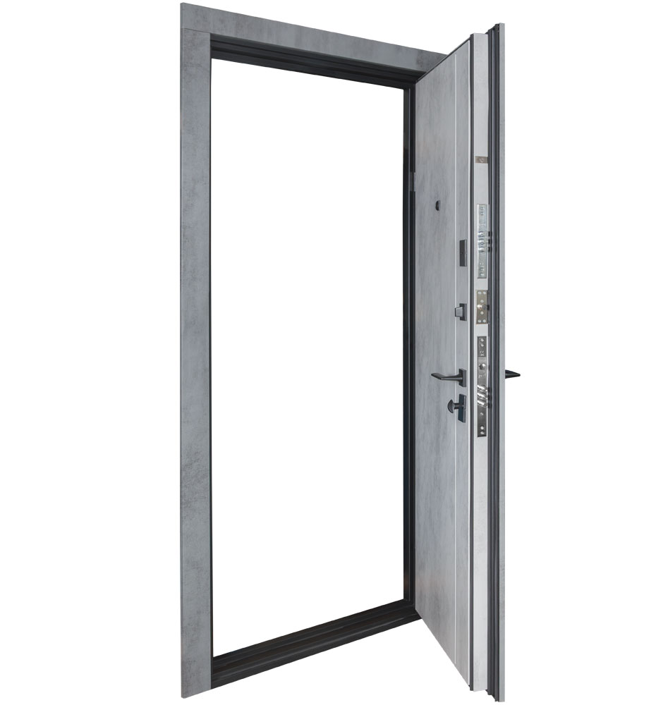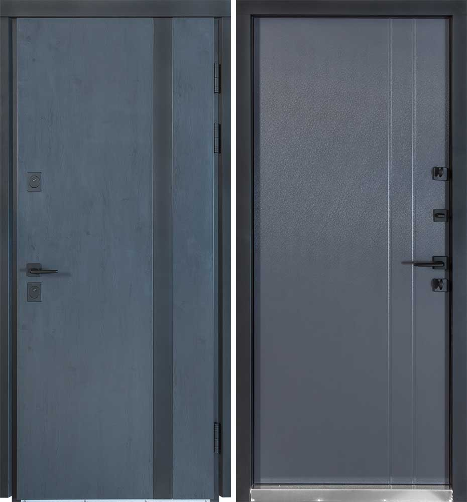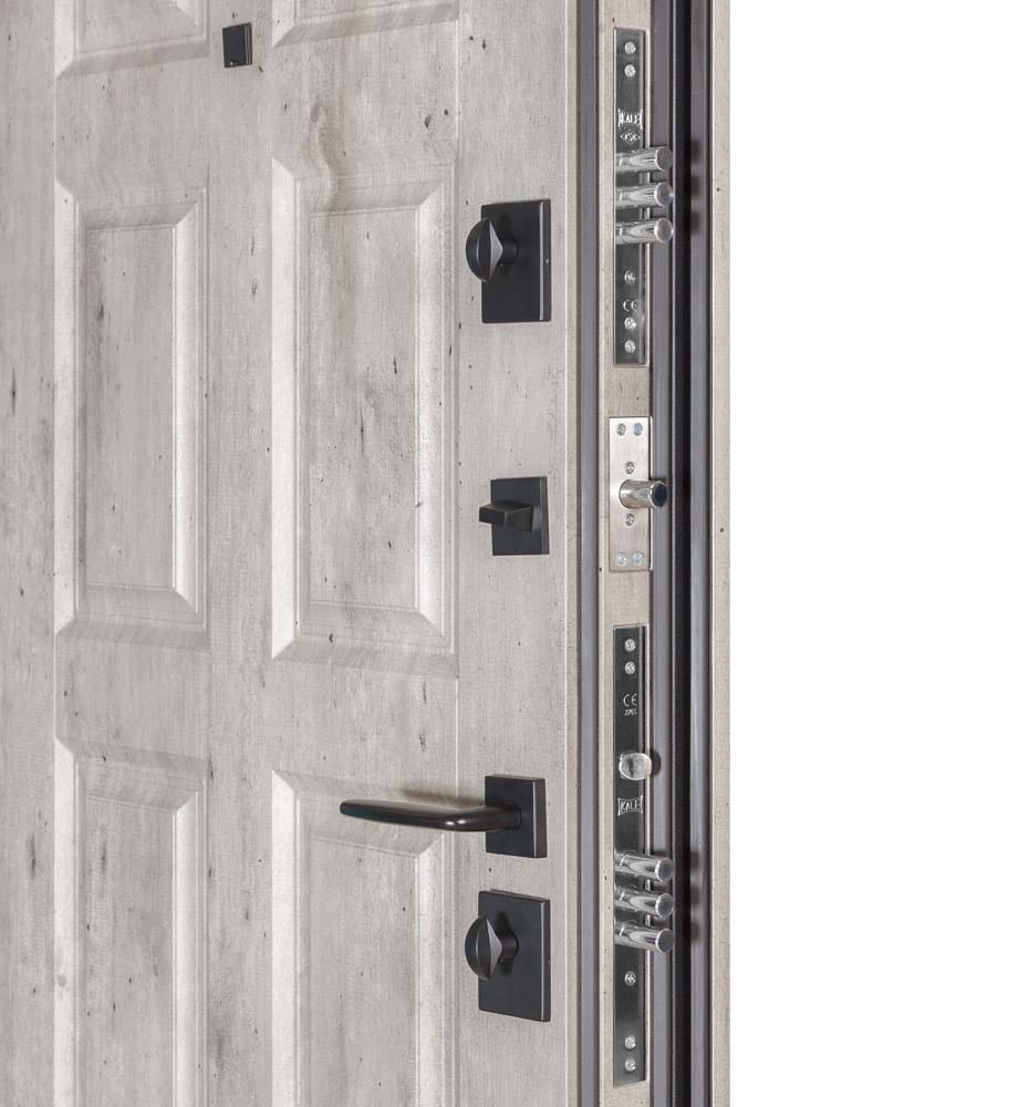 Булат POWER (квадро) 950 ліві — каркас пофарбований у колір Metalic Black – чорна. Зовнішня панель моделі – 194, внутрішня панель моделі – 607 дзеркало без вічка. ПВХ покриття виконане в кольорах: Венге Горизонт Темний (горизонт) №12 / Бетон Сірий 130 №25. Оснащені квадратною хром матовий фурнітурою, замком Mottura 3D Key, серійний номер дверей Т2159.