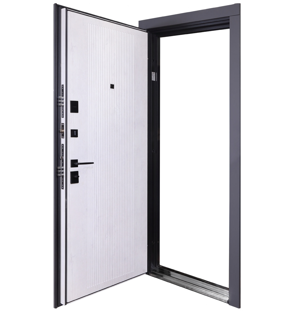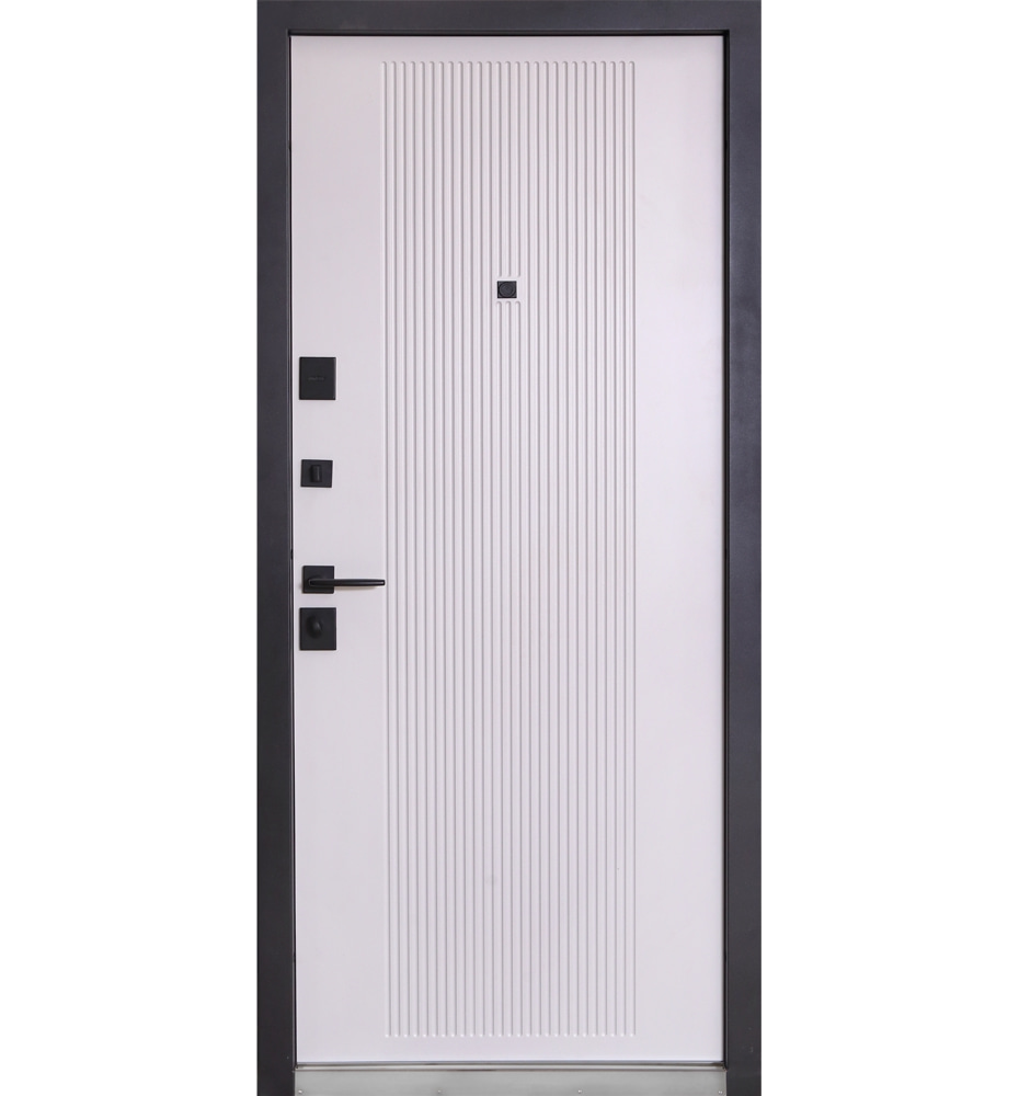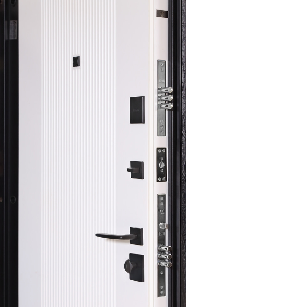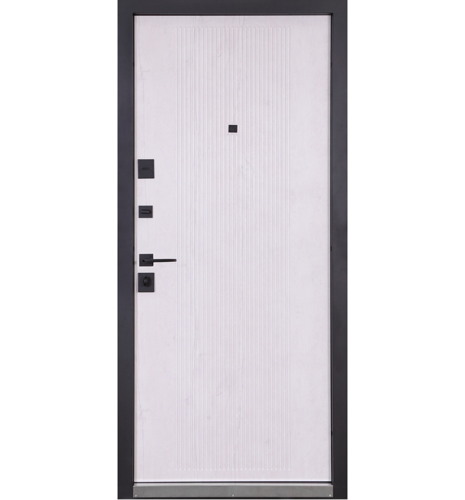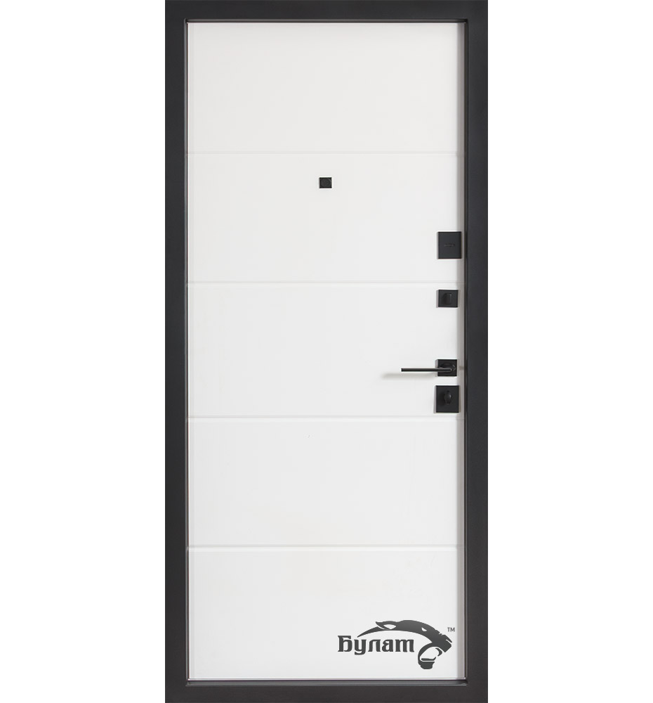 Булат Термо Електро (квадро), 850 праві — каркас пофарбований у кольори Metalic Black – чорна та Metalic White – біла. Нержавіючий поріг. Зовнішня панель моделі – 590 чорний молдинг, внутрішня панель моделі – гладка. ПВХ покриття виконане в кольорах: Зріз каменю №134 та Білий матовий гладкий №37. Оснащені квадратною чорною фурнітурою, електронним замком PES та замком KALE, серійний номер дверей F1749-3.