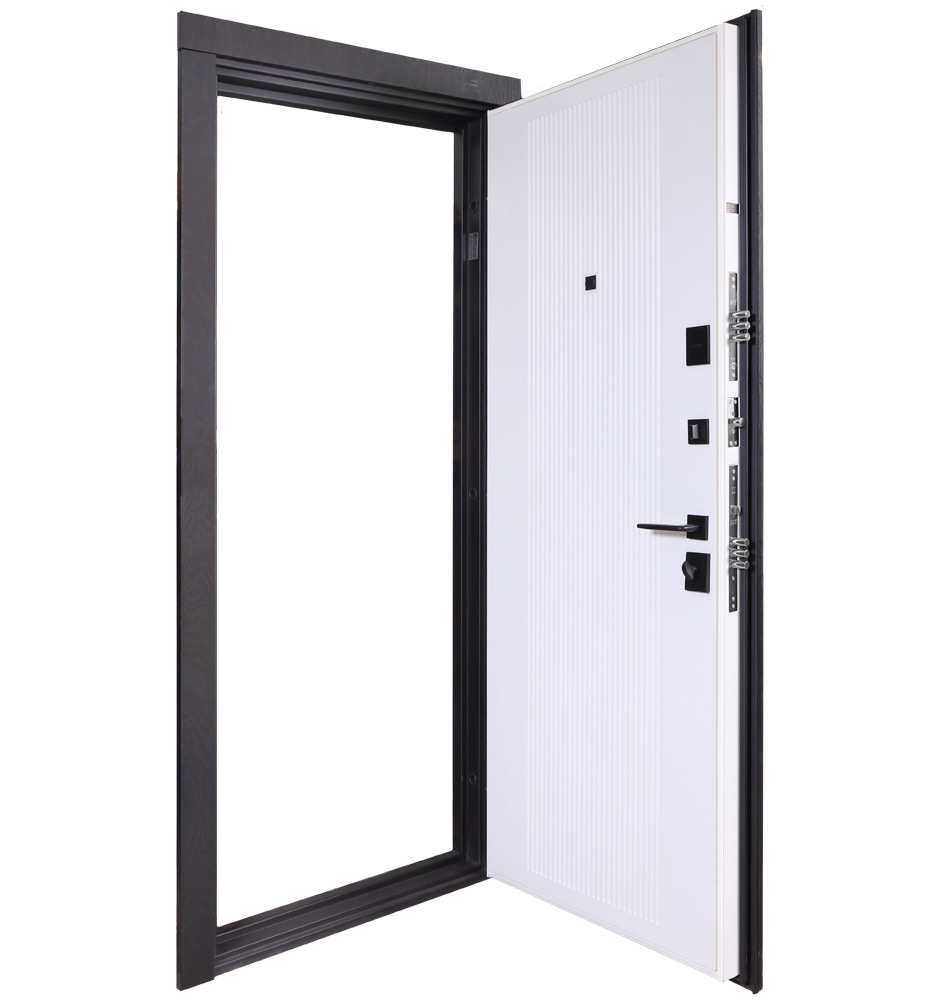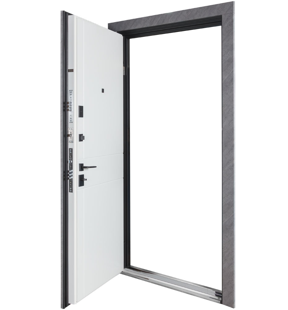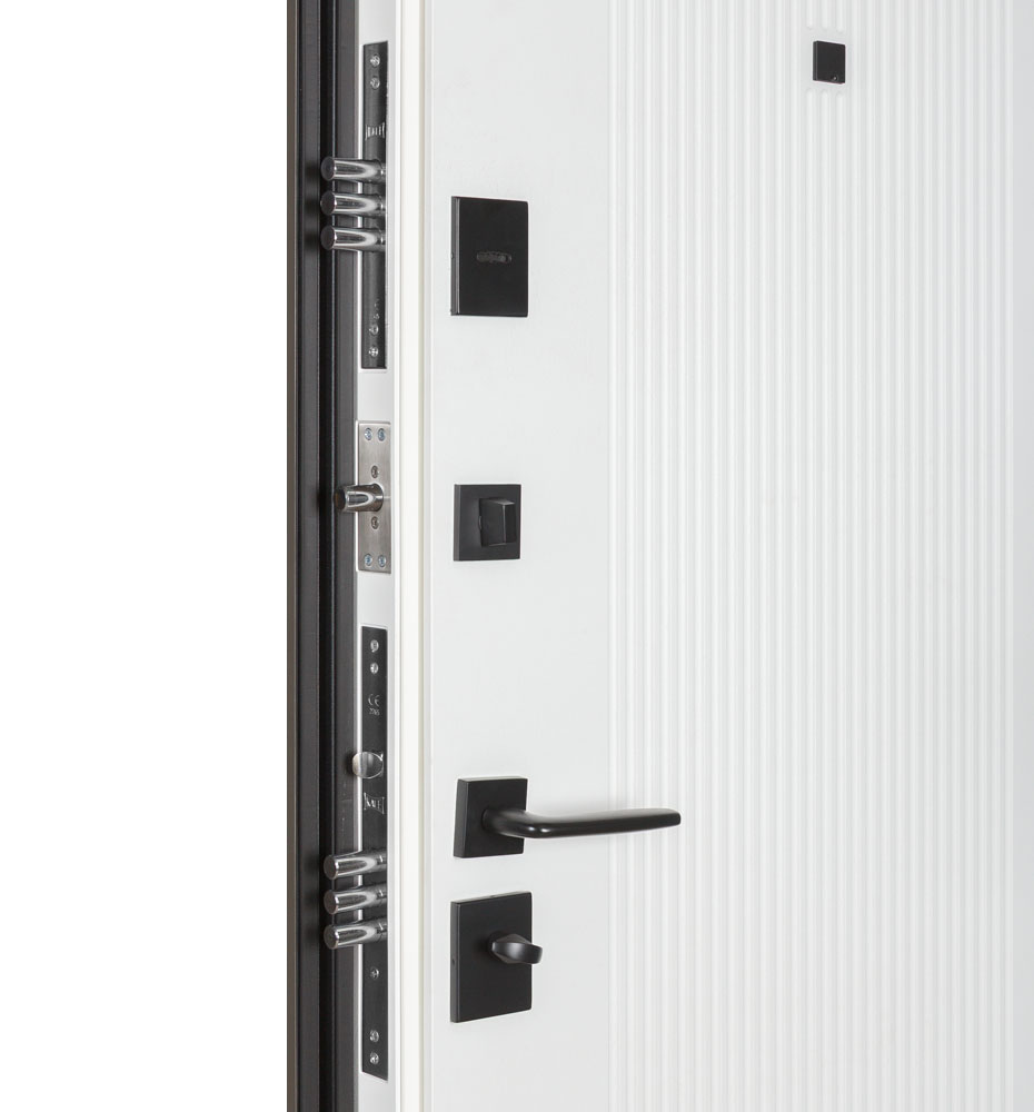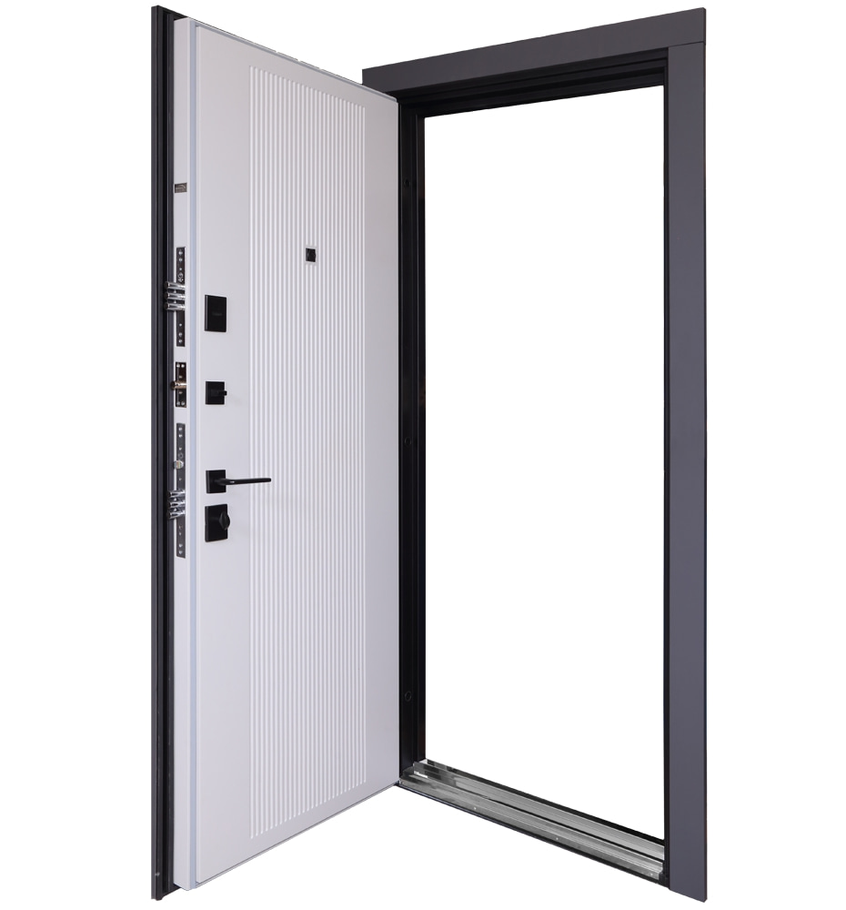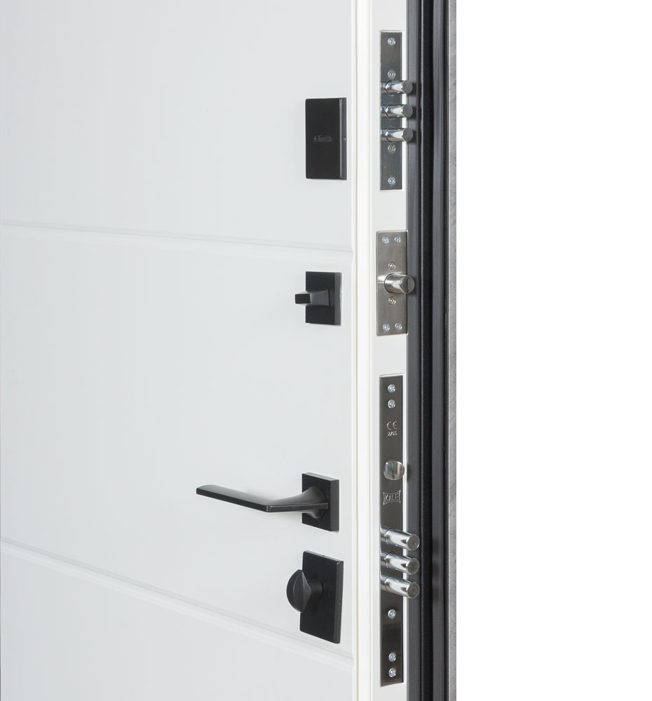 Булат Термо Електро (квадро), 850 праві — каркас пофарбований у кольори Metalic Black – чорна та Metalic White – біла. Нержавіючий поріг. Зовнішня панель моделі – 590 чорний молдинг, внутрішня панель моделі – гладка. ПВХ покриття виконане в кольорах: Зріз каменю №134 та Білий матовий гладкий №37. Оснащені квадратною чорною фурнітурою, електронним замком PES та замком KALE, серійний номер дверей F1749-3.
