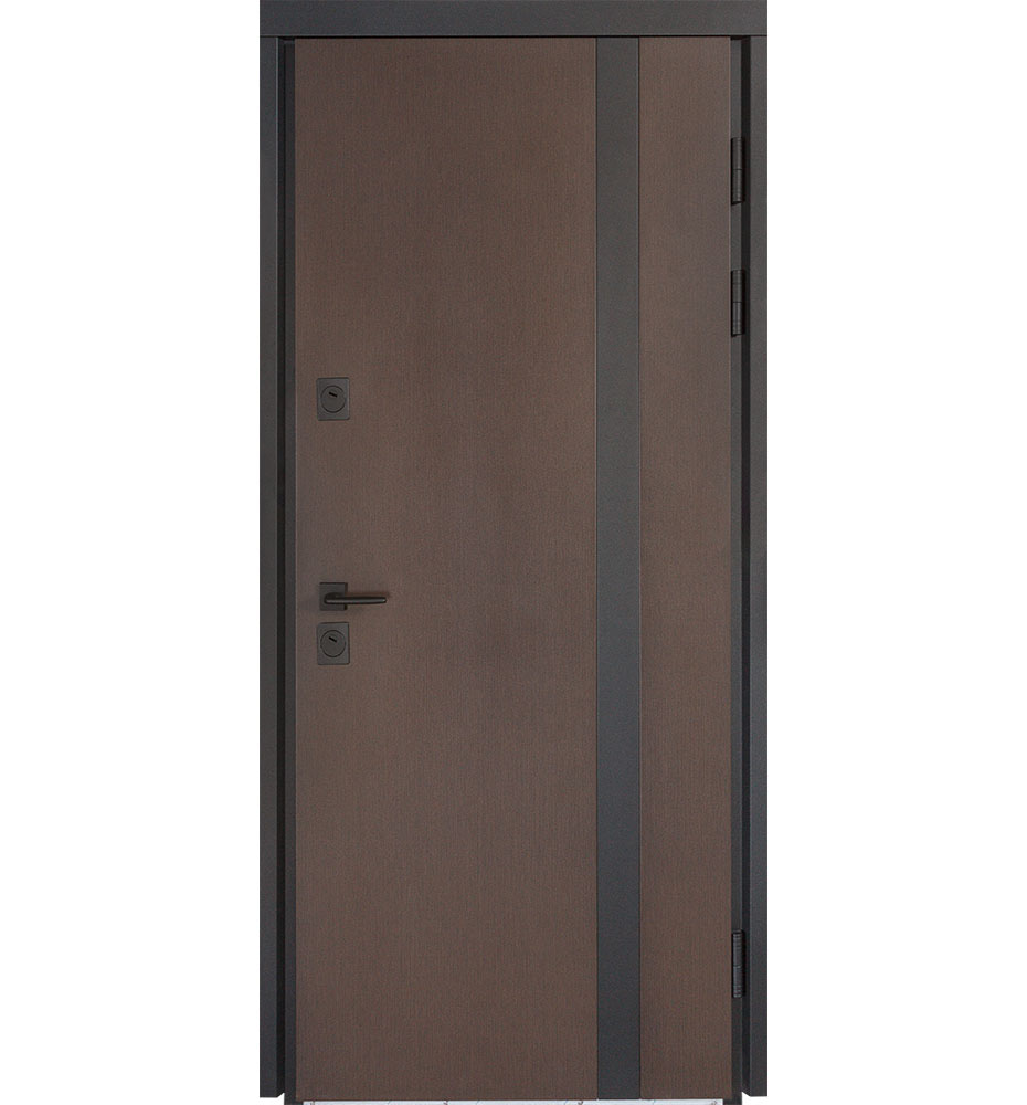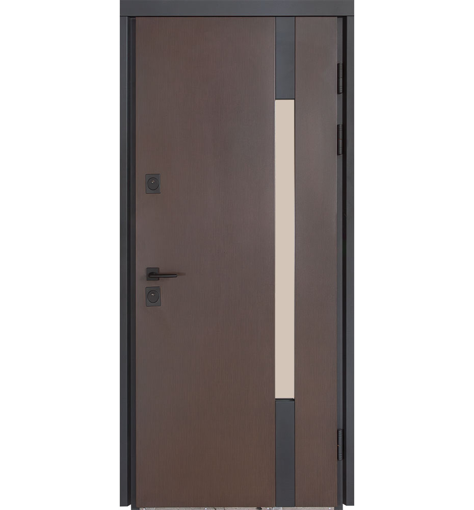Булат Термо Стріт 950 мм праві — каркас пофарбований у колір Metalic Black – чорна. Нержавіючий поріг. Зовнішня панель моделі – металева сендвіч-панель модель 705 (склопакет), внутрішня панель моделі – 431. Колір зовнішнього покриття – Дуб бронза. ПВХ покриття виконане в кольорі: Вулична Молочний. Оснащені квадратною фурнітурою в чорному кольорі, замками Securemme, серійний номер дверей F0948.
