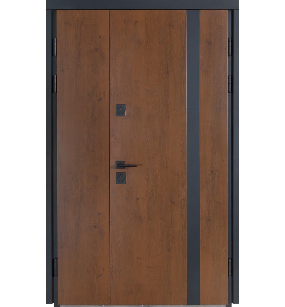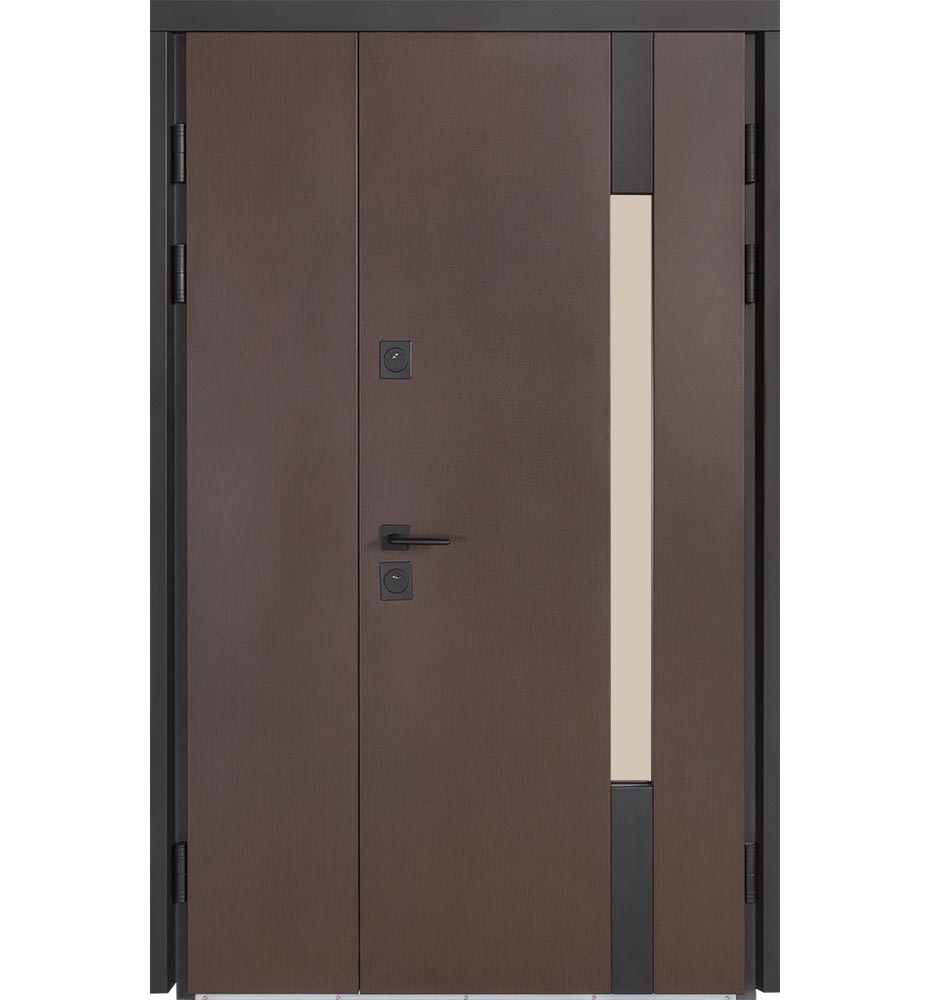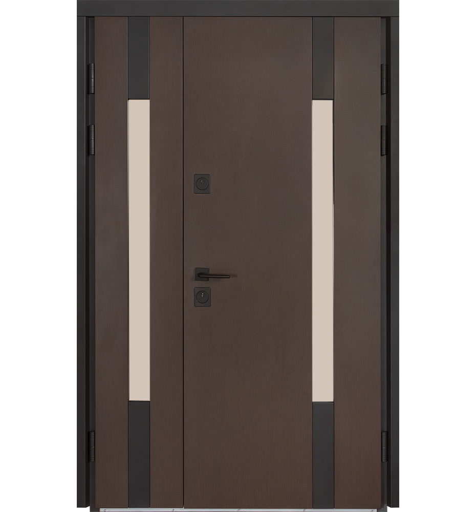 Булат Термо Європа, 1200 мм ліві — каркас пофарбований у колір Metalic Black – чорна. Нержавіючий поріг. Зовнішня панель моделі – металева сендвіч-панель модель 706 (два склопакети), внутрішня панель моделі – 431. Колір зовнішнього покриття – Венге темний. ПВХ покриття виконане в кольорі: Вулична венге темне. Оснащені квадратною фурнітурою в чорному кольорі, замками KALE, серійний номер дверей F0735/2.