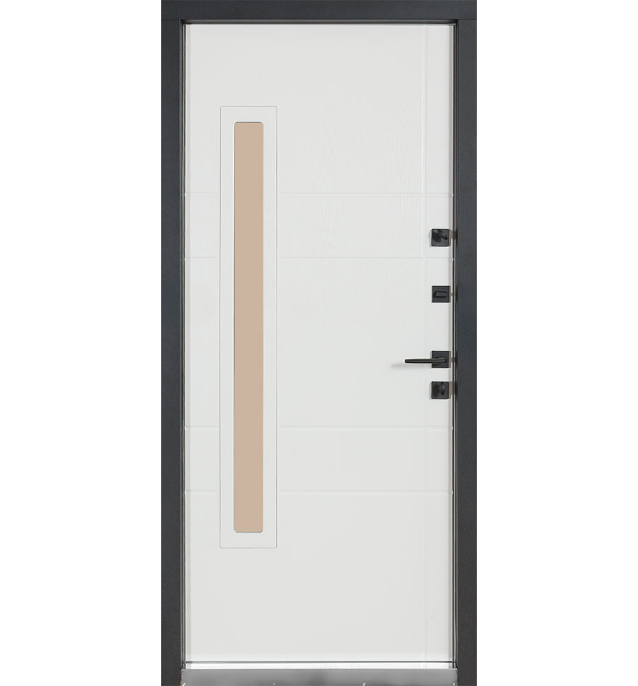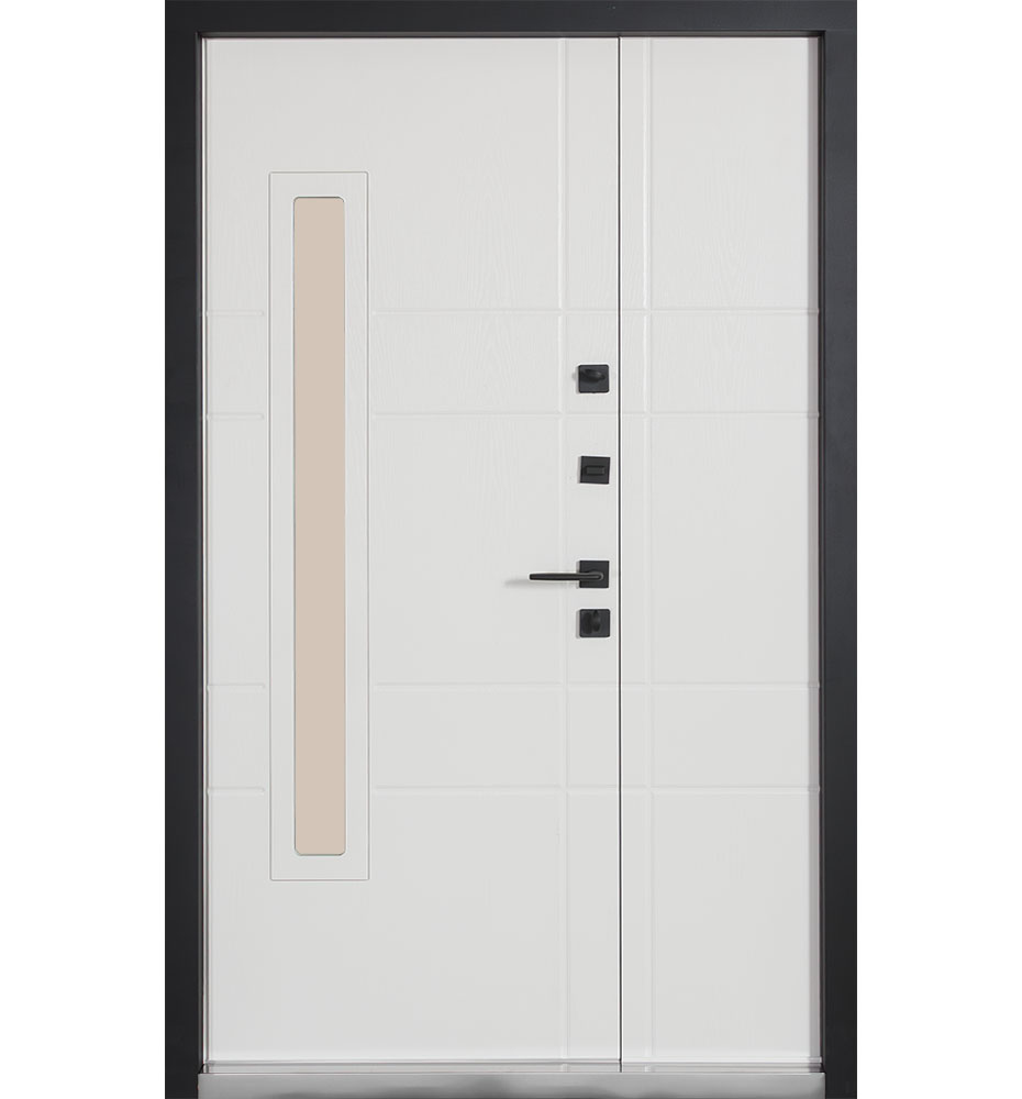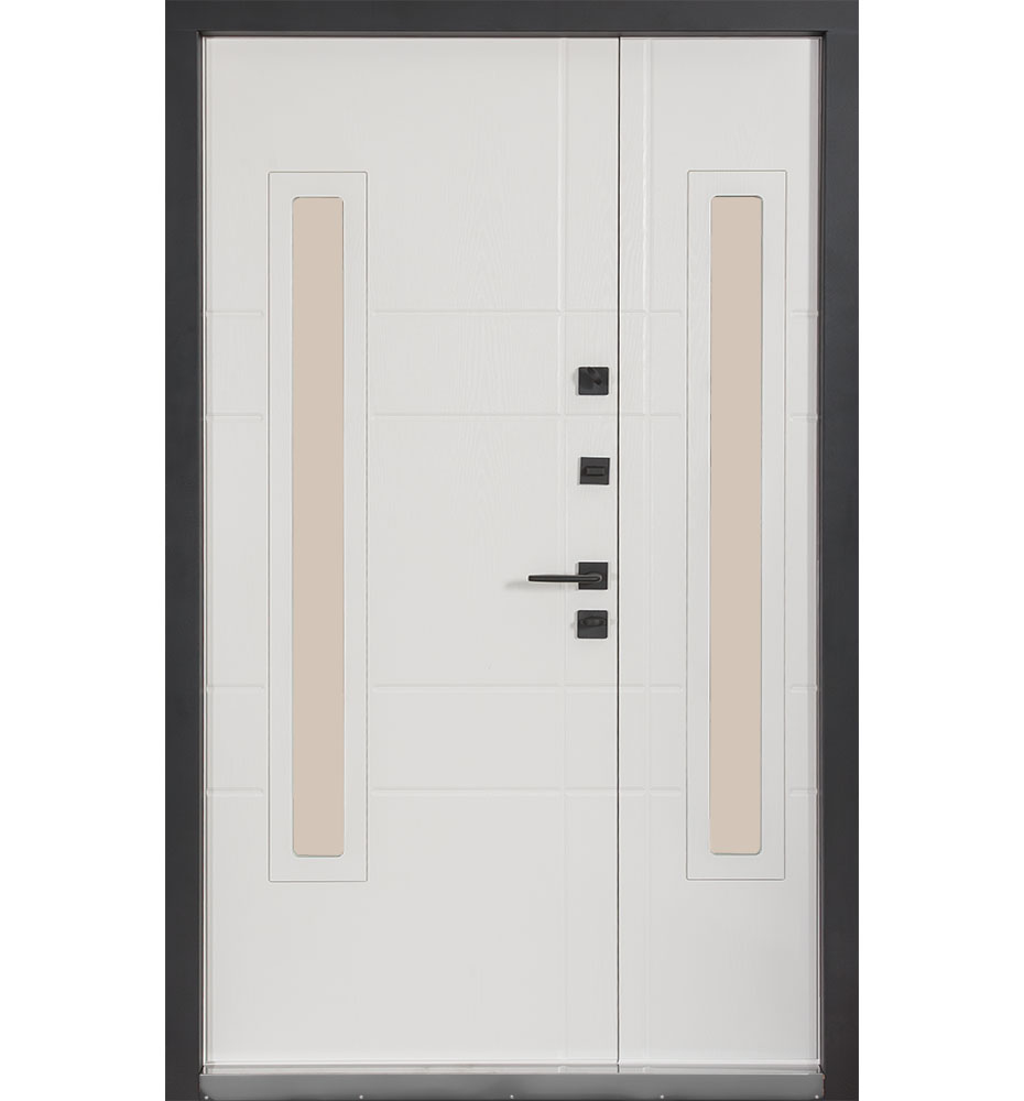 Булат Котедж 850 мм праві — каркас пофарбований у колір Metalic Black – чорна. Зовнішня панель моделі – металева сендвіч-панель модель 705 (склопакет), внутрішня панель моделі – 431. Колір зовнішнього покриття – Венге темний. ПВХ покриття виконане в кольорі: Вулична Білий атласний. Оснащені квадратною фурнітурою в чорному кольорі, замками KALE, серійний номер дверей F1439.
