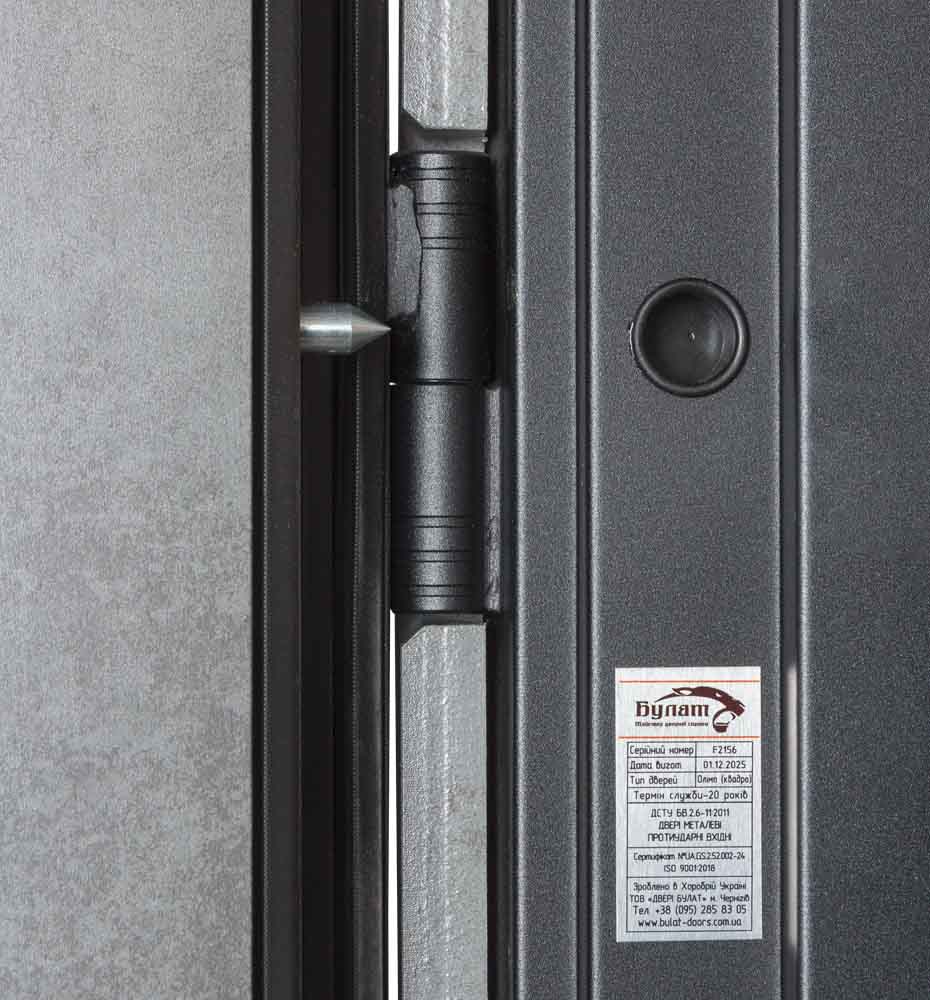 Булат Олімп, 850 ліві — каркас пофарбований у колыр Metalic Black – чорний. Нержавіючий поріг. Зовнішня панель моделі – 594 чорний молдинг, внутрішня панель моделі – 589 чорний молдинг. ПВХ покриття виконане в кольорі Оксид темний. Оснащені квадратною чорною фурнітурою в чорному кольорі, замком Mottura, серійний номер дверей F2156.