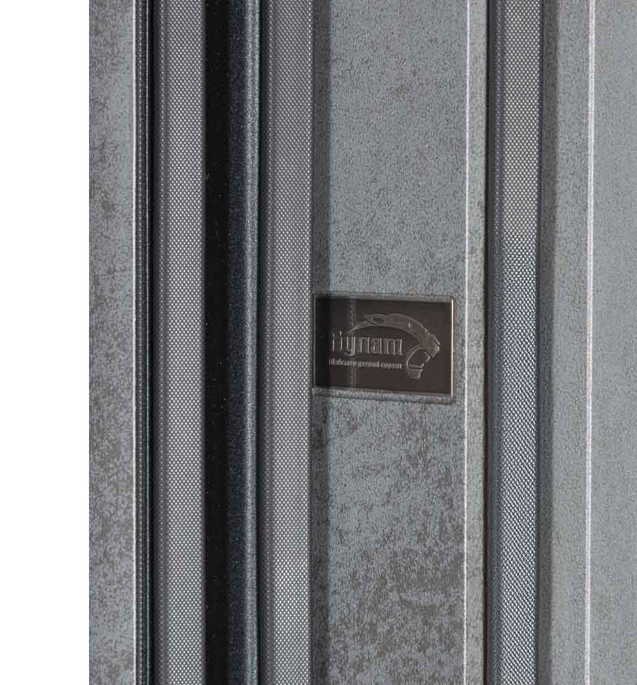 Булат Гарант (квадро) 2230*1100 ліві нестандартні — каркас пофарбований у колір Metalic Grafite – графіт. Зовнішня панель моделі – 117, внутрішня панель моделі – 117. ПВХ покриття виконане в кольорах: Дуб Шале Графит 123 №15, Дуб немо срібний №68. Оснащені квадратною хром матовий фурнітурою, замком Кале, серійний номер дверей Т2157.