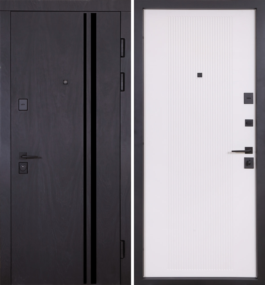 Булат Ультра, 850 ліві — каркас пофарбований у колір Metalic Black – чорна. Нержавіючий поріг. Зовнішня панель моделі – 587 чорний молдинг, внутрішня панель моделі – 276. ПВХ покриття виконане в кольорах: Мусонне дерево та Рустик Авіньон блан. Оснащені квадратною чорною фурнітурою, замками Securemme, серійний номер дверей L0173.