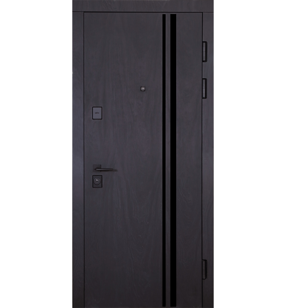 Тандем (квадро) 850 ліві — каркас пофарбований у колір Metalic Black – чорна. Нержавіючий поріг. Зовнішня панель моделі – 425 вставка Дуб немо лате №84, внутрішня панель моделі – 215. ПВХ покриття виконане в кольорах:Чорна шагрень №74 та Венге Південне темне №3. Оснащені квадратною чорною фурнітурою, замком Kale, серійний номер дверей F0828.