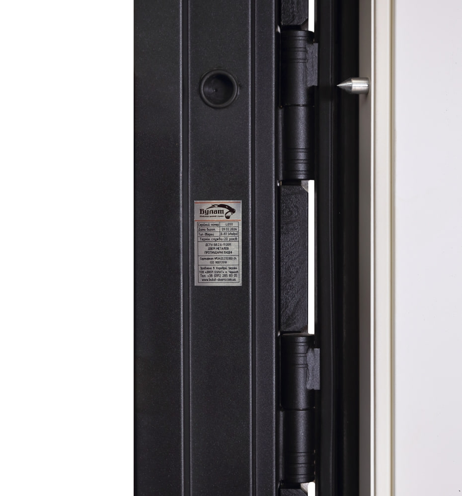 Булат Термо Power, 850 праві — каркас пофарбований у кольори Metalic Black – чорна/Metalic White – біла Нержавіючий поріг. Зовнішня панель моделі – 234, внутрішня панель моделі – 234. ПВХ покриття виконане в кольорах: Mamba Morion 3D та White Slate 3D. Оснащені овальною фурнітурою в кольорі хром, замком Mottura та накладкою DISEC MAGNETIC, серійний номер дверей S2078.