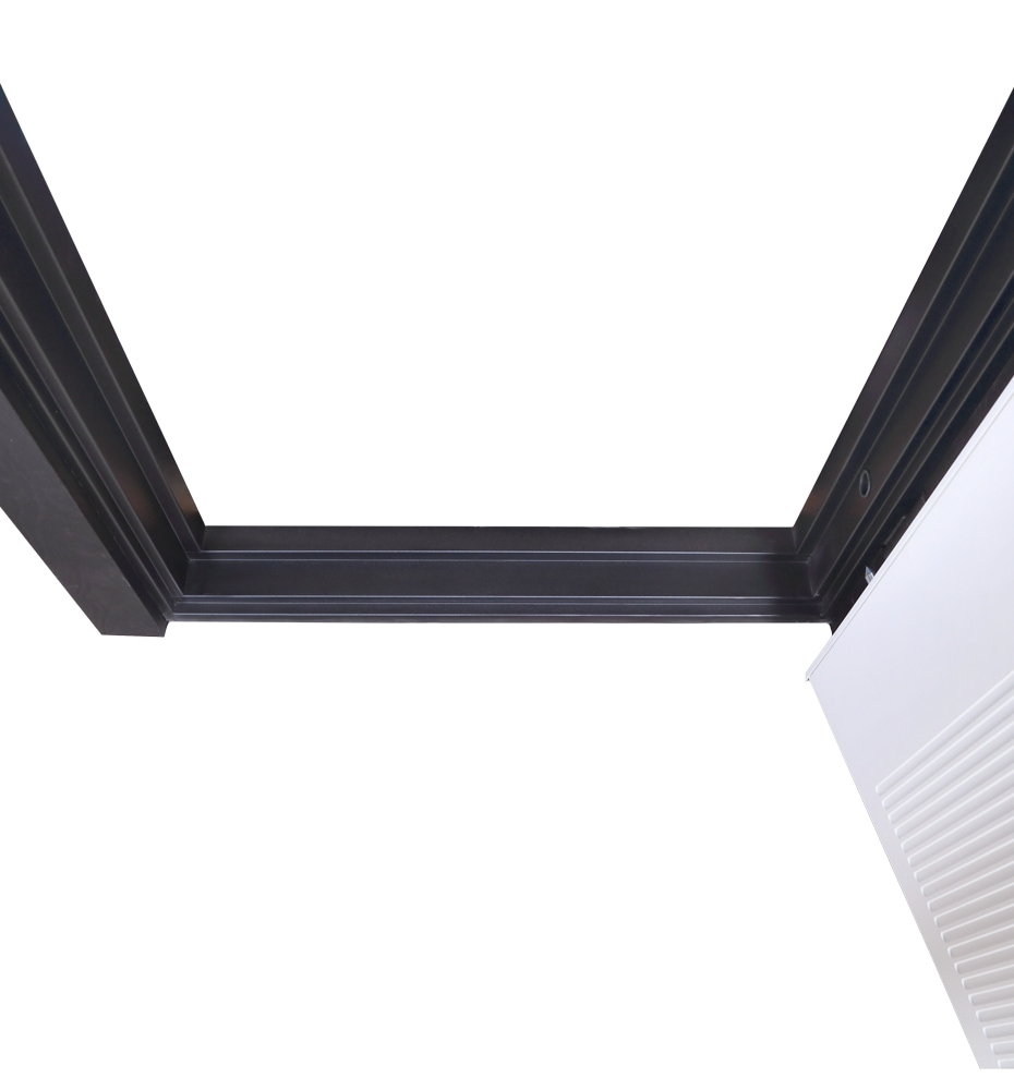 Revolut Doors В-83 (квадро), 850 праві — каркас пофарбований у колір Metalic Black – чорна. Зовнішня панель моделі – 554 чорний молдинг, внутрішня панель моделі – 554 чорний молдинг. ПВХ покриття виконане в кольорах: Оксид темний та Оксид світлий. Оснащені квадратною фурнітурою в чорному кольорі, замками KALE, серійний номер дверей F1993.
