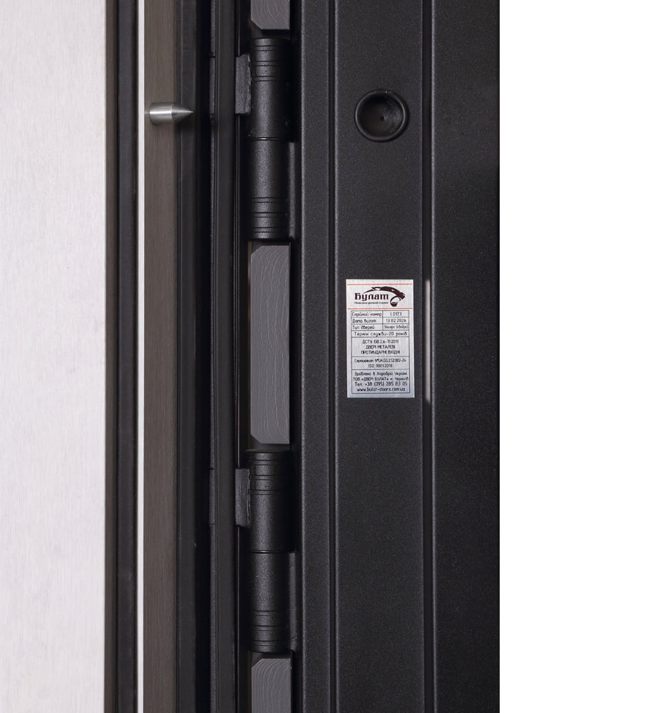 Булат Термо Secret, 850 ліві — каркас пофарбований у кольори RAL7022 Графіт та RAL9003 Біла. Нержавіючий поріг. Зовнішня панель моделі – 192, внутрішня панель моделі – 228. ПВХ покриття виконане в кольорах: Граніт матовий та Біла шагрень. Оснащені овальною фурнітурою в кольорі хром, замками Securemme, накладками DISEC MAGNETIC (2 шт., тандем), серійний номер дверей S2079.