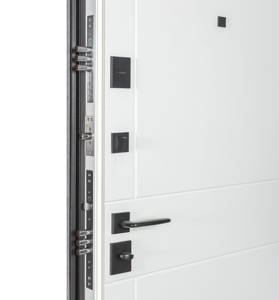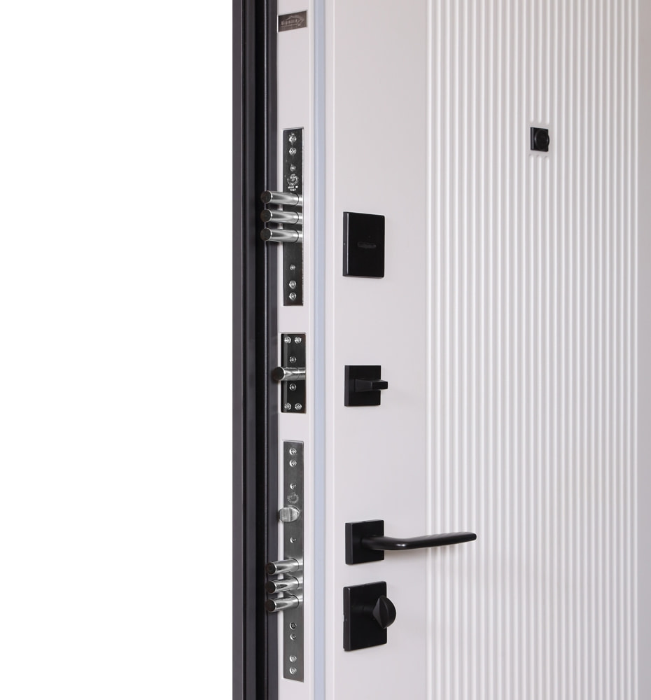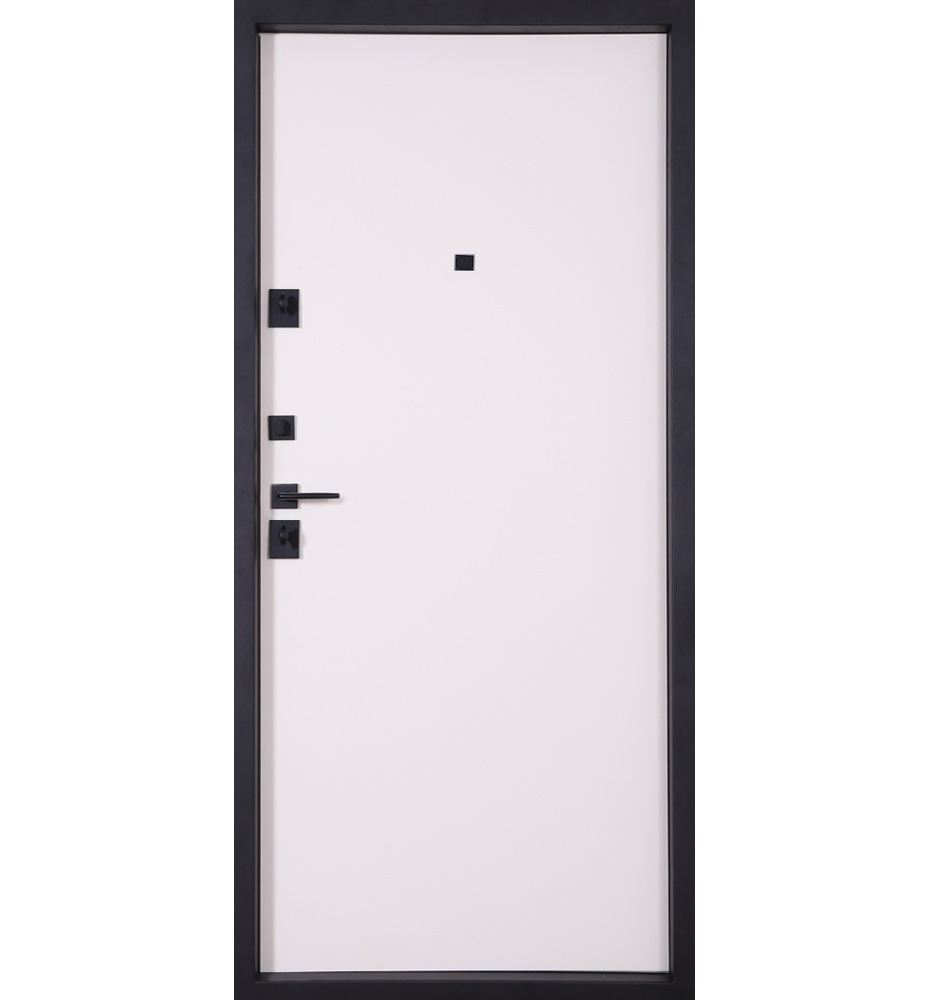 Revolut Doors В-83 (квадро), 850 праві — каркас пофарбований у колір Metalic Black – чорна. Зовнішня панель моделі – 587 чорний молдинг, внутрішня панель моделі – 276. ПВХ покриття виконане в кольорах: Індивідуальне ПВХ та Білий матовий гладкий. Оснащені квадратною фурнітурою в чорному кольорі, замками KALE, серійний номер дверей L0111.