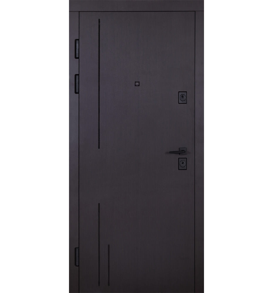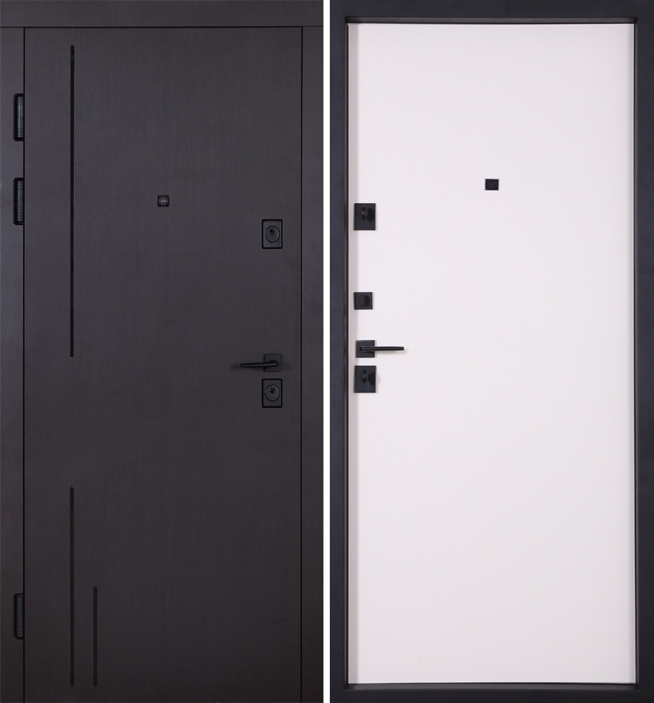 Булат Котедж, 950 мм праві — каркас пофарбований у колір Metalic Black – чорна. Зовнішня панель моделі – металева сендвіч-панель модель 710, внутрішня панель моделі – 265. Колір зовнішнього покриття – Венге темний. ПВХ покриття виконане в кольорі: Вулична Білий атласний. Оснащені квадратною фурнітурою в чорному кольорі, замками KALE, серійний номер дверей F1438.