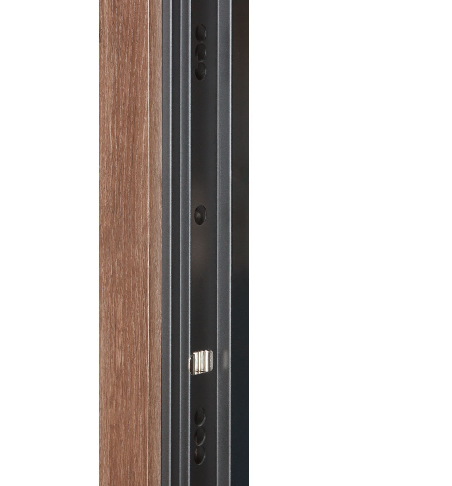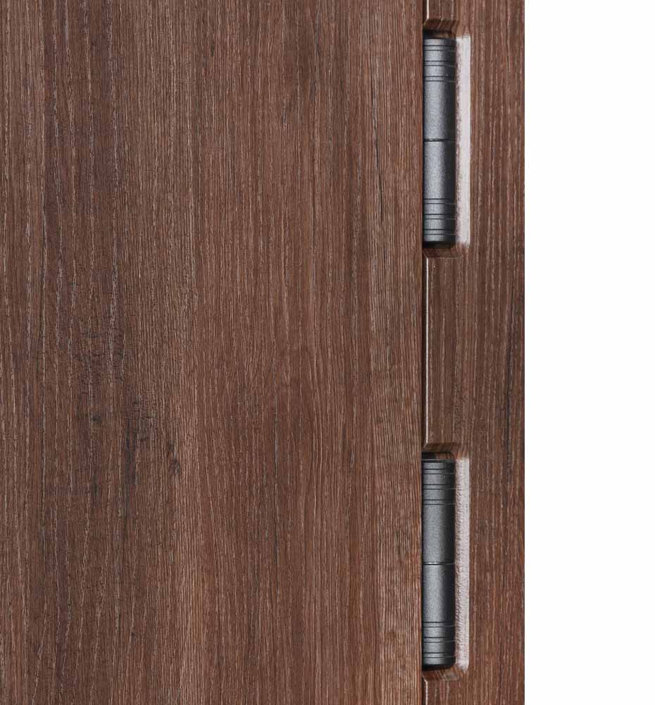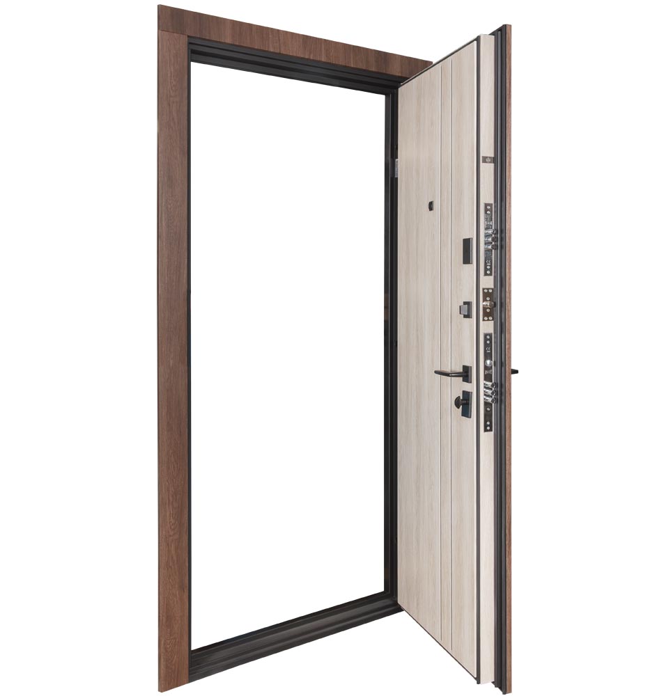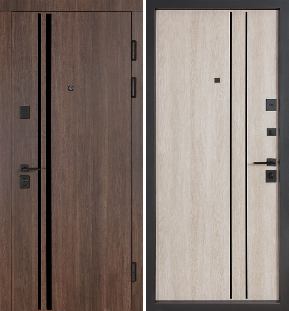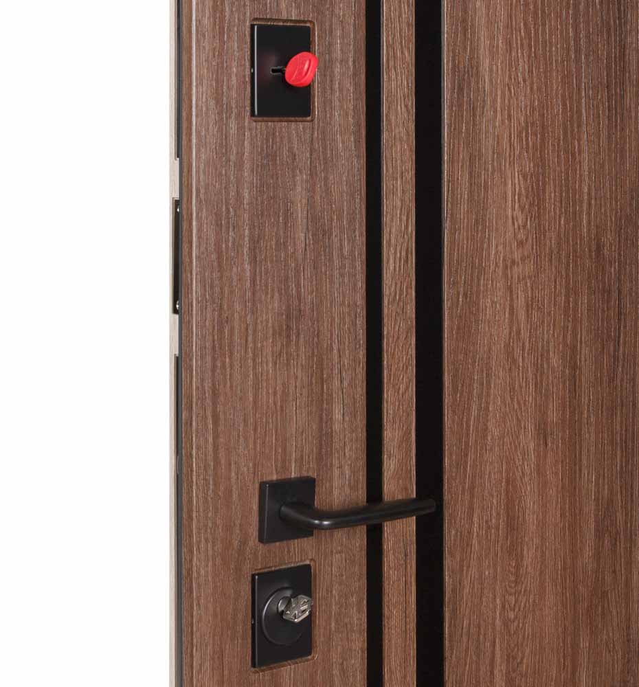 Ці двері виглядають сучасно та стильно завдяки використанню молдингів з композиту чорного кольору. Колір дверей і ззовні, і зсередини – коричневий, під деревину, що додає їм елегантності та класичності.