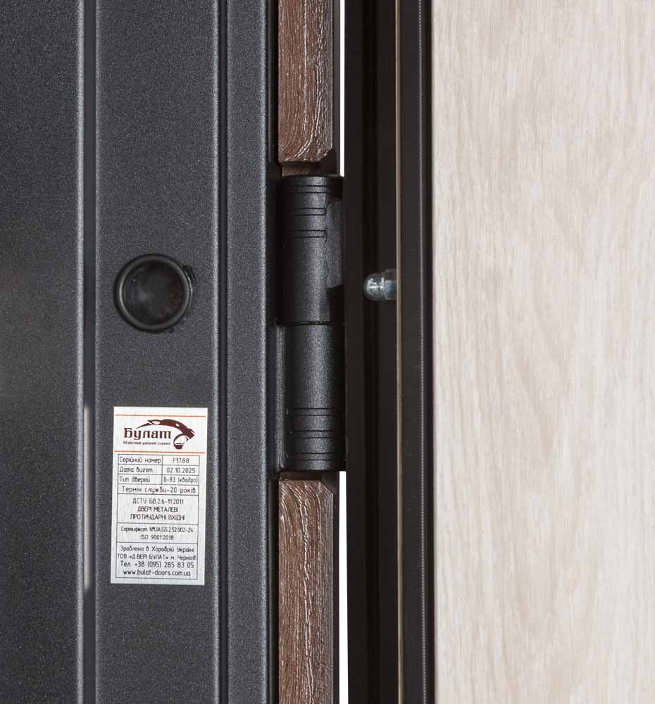 Товщина металу на коробці – 1.2 мм, Товщина профіля металу на полотні 1,2 мм. товщина листа металу на полотні – 1 мм, в області замків є додаткова кишеня товщиною 1.2 мм, яка захищає замки від зламу. Каркас дверей пофарбований з двох сторін порошковою фарбою для довговічної експлуатації виробу. Вага дверей досягає 98 кг.