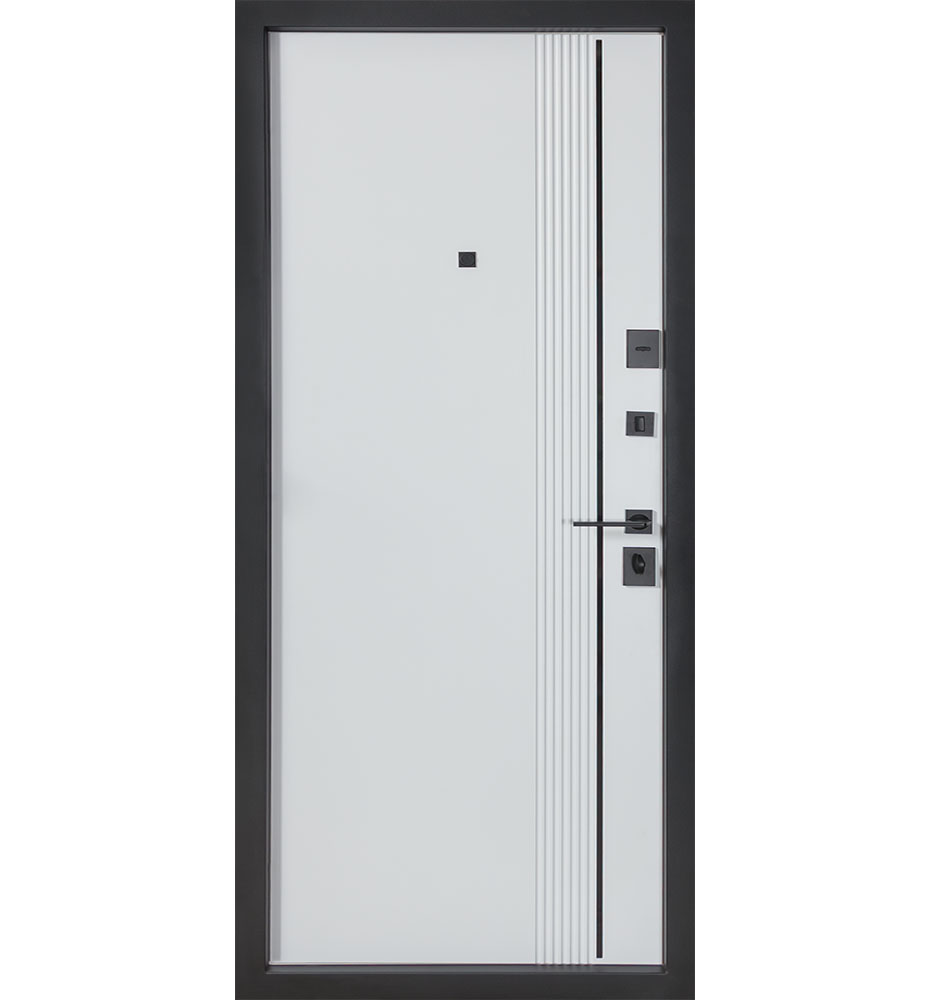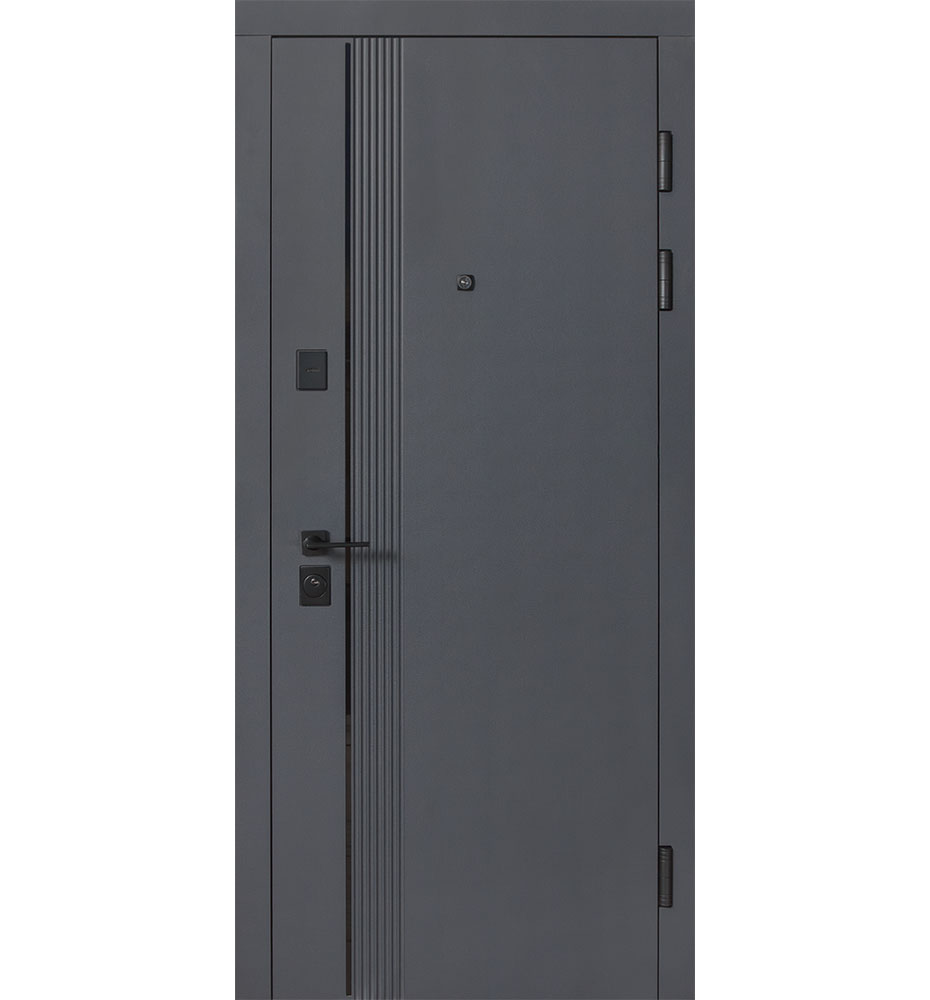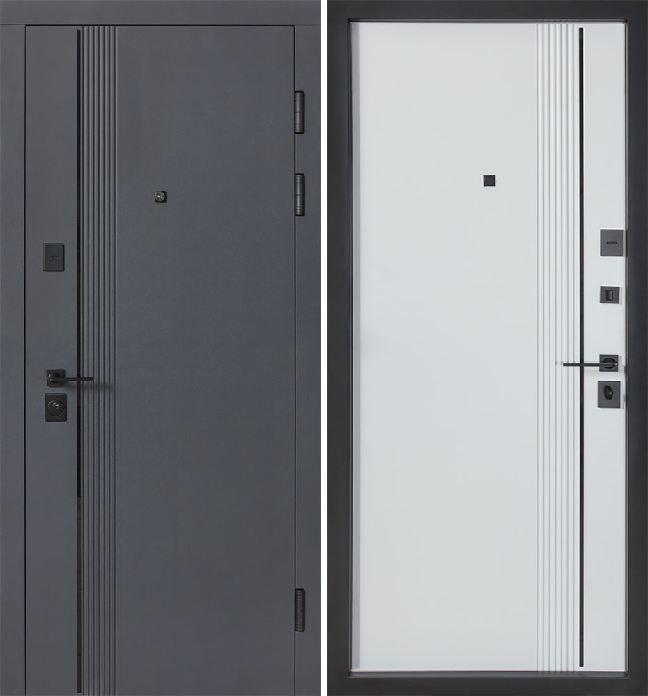 Вертикальні чорні молдінги на зовнішній та на внутрішній МДФ-накладці надають дверям сучасного стилю, а квадратна чорна фурнітура додає їм вишуканості.