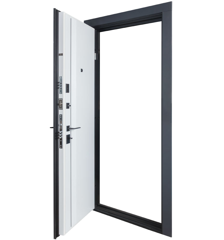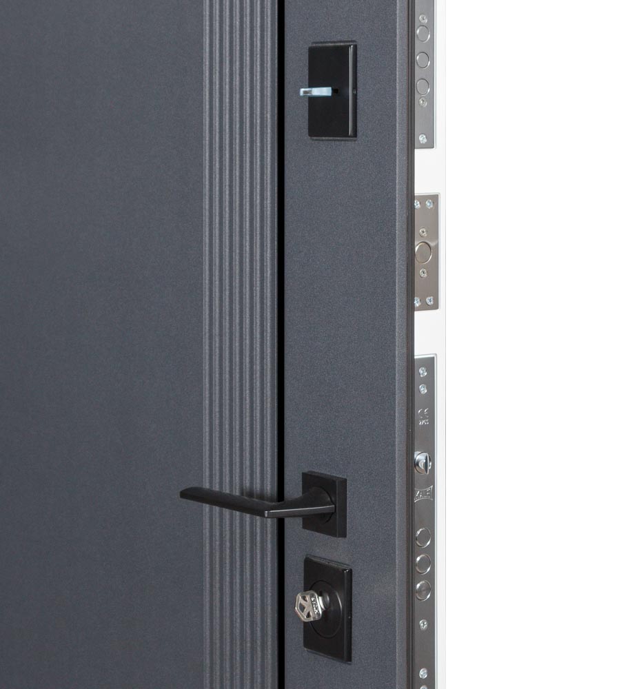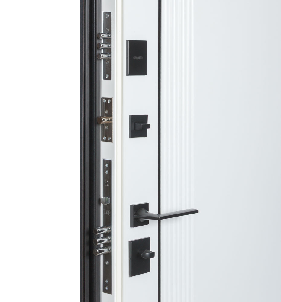 Дверне полотно утеплено мінеральною ватою та оснащено трьома контурами ущільнення, які збережуть тепло у квартирі та вбережуть помешкання від протягів і неприємних запахів з під’їзду. Регулятор притвору Securemme забезпечить дверям м’яке та щільне закривання.