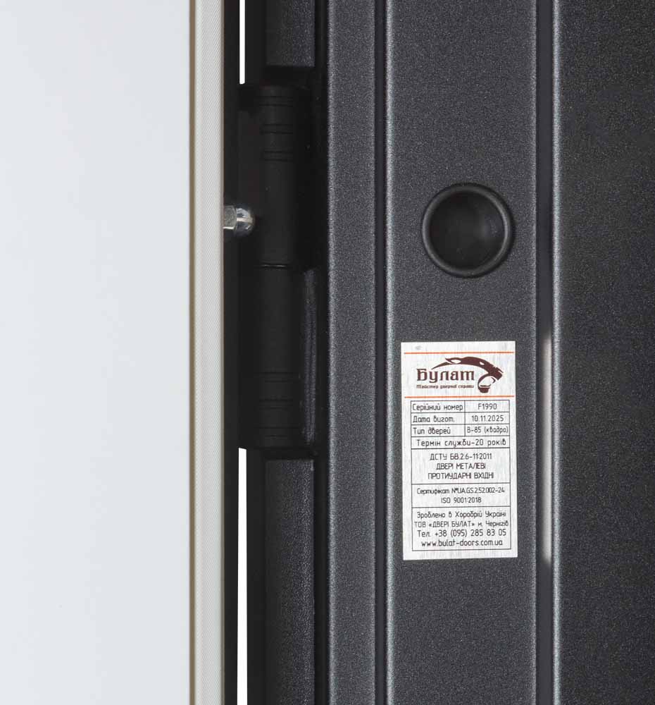 Двері виготовленні з холоднокатаної сталі. Товщина металу на коробці – 1.2 мм, товщина профіля металу на полотні 1,2 мм, товщина листа металу на полотні – 1 мм. На полотні встановлено три антизрізи для захисту петель від спилу.
