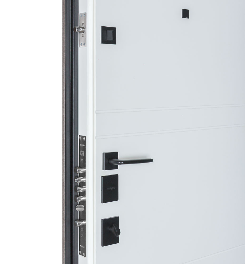 Двері укомплектовані трьома протизламними ригелями діаметром 14 мм, їх ще називають “антизрізами”. Вони убезпечують оселю від проникнення злодіїв. В тому випадку, якщо дверні петлі спиляють болгаркою, двері будуть зафіксовані в коробці, завдяки антизрізам.