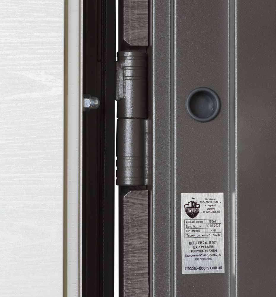 Вага дверей становить: 92 кг, 98 кг, в залежності від розміру. Що свідчить про її міцність та надійність, а три петлі захистять двері від провисання та забезпечать їм плавність ходу при відкриванні.
