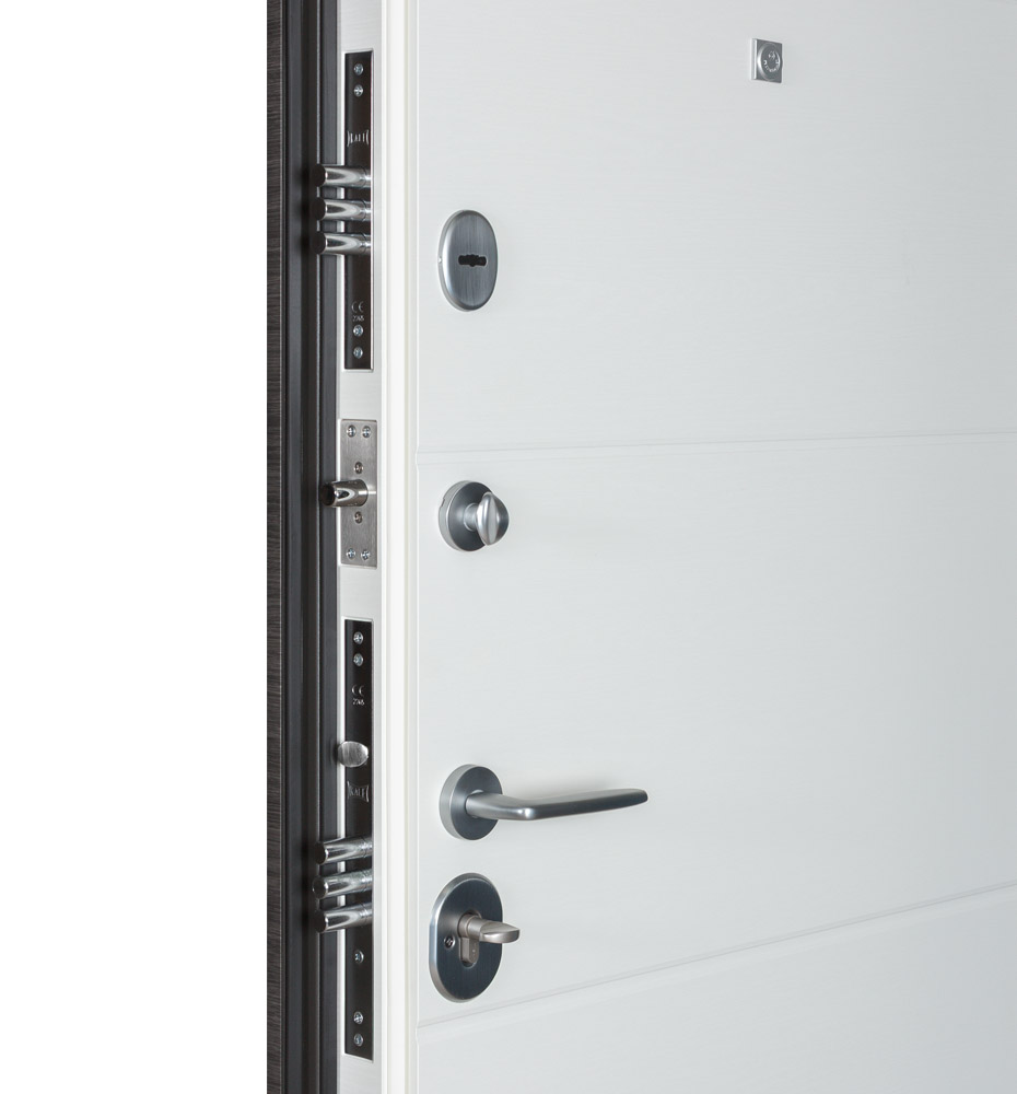 Двері укомплектовані трьома протизламними ригелями діаметром 14 мм, їх ще називають “антизрізами”. Вони убезпечують оселю від проникнення злодіїв. В тому випадку, якщо дверні петлі спиляють болгаркою, двері будуть зафіксовані в коробці, завдяки антизрізам.